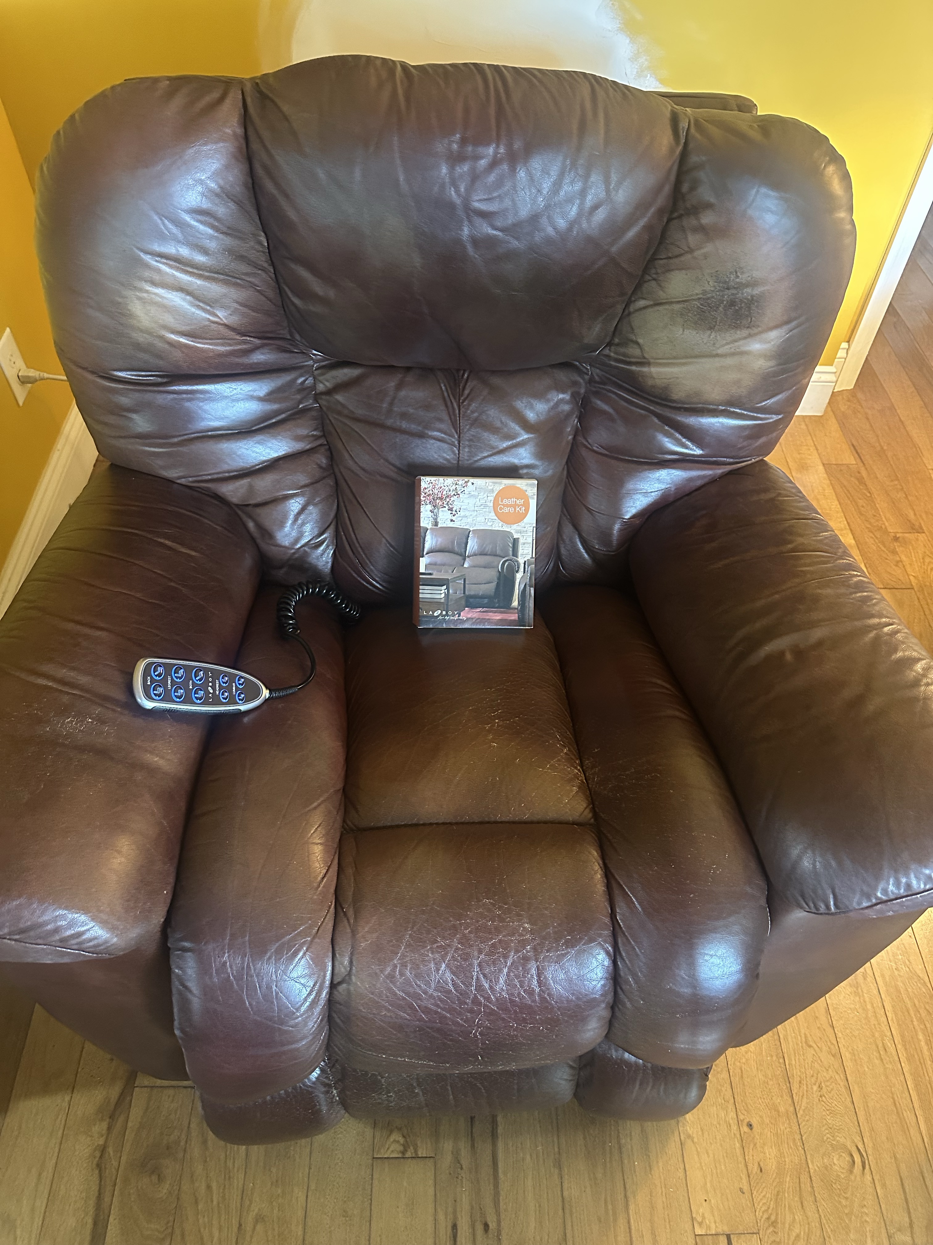 Super comfortable LA-Z Boy Remote Control Electric Leather Recliner, includes leather care kit with a bottle of leather cleaner and leather protector. There is some wear and paint rubbing, but no holes or tears. Remote adjusts the leg rest, headrest, and lumbar support.