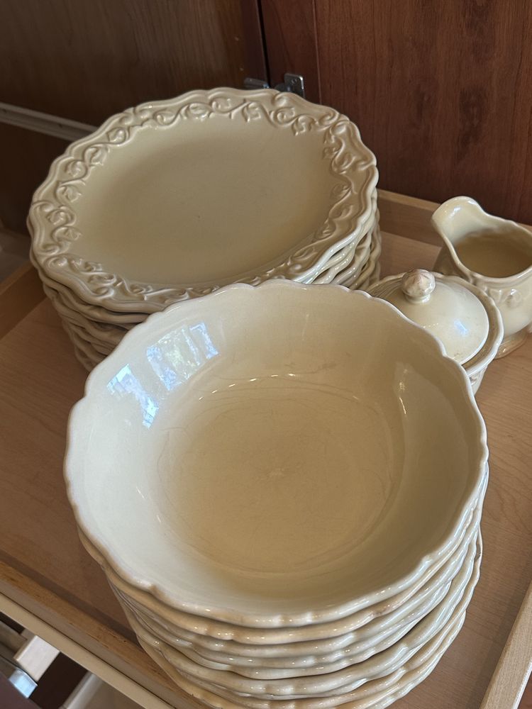 Chris Madden for JCPenney 10 Place Settings Stoneware, includes 10 dishes, 10 bowls, 10 salad plates, 8 mugs , sugar and creamer, and 3-piece serving plates. No chips and some spidering on some pieces. Yellow/ gold color.