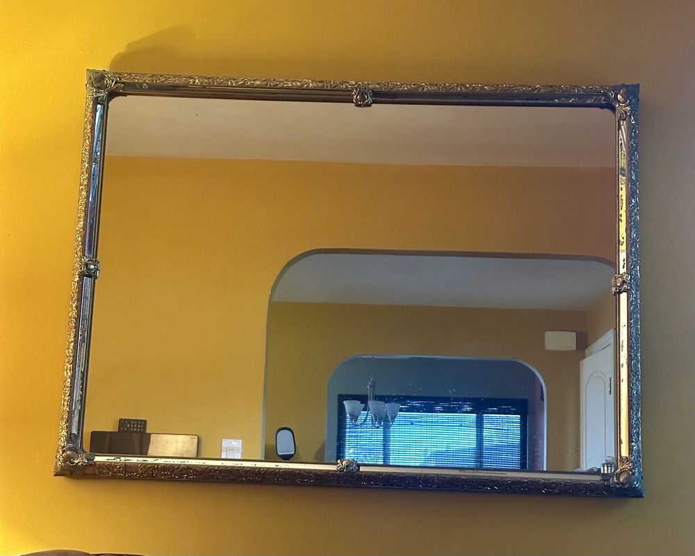 Vintage wall mirror with wood overlay. Beveled mirror sides. Some wood overlays are missing. Approximate H 33 x W 44. Plus modern decorative round metal mirror with enamel accents. W 20 x H 22.5