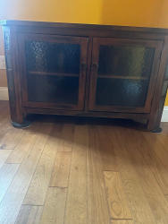 Wooden Television Cabinet.2 doors, 4 shelves. W 45 1/4 x D 18 x H 27 1/4. Angled sides with faux stone accents. Doors have quality frosted see through panels. Beautiful and functional piece of furniture.