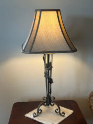 Single, 3-leg metal lamp with scroll and leaf design. 30 inches tall. Plus pair of matching metal-base lamps with glass centers and crushed velvet floral shades.