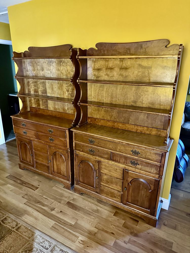 Early American style matching pair of solid cherry wood hutches. Detachable upper 3-shelf unit over 3 drawers and 2 enclosed storage shelves. Pegged joinery. Believed to be craftsman-made special order many years ago. These are solid, weighty pieces of furniture. Bring help to move. (L 42.5 x W 13.5 x H 70.5 each.)