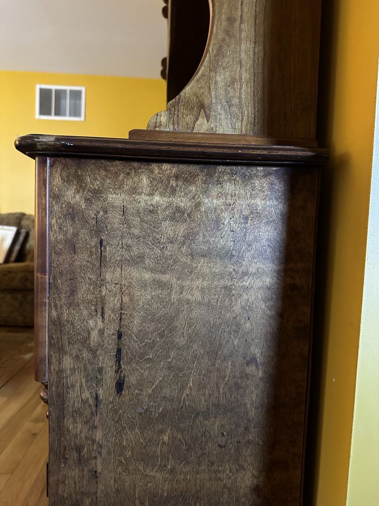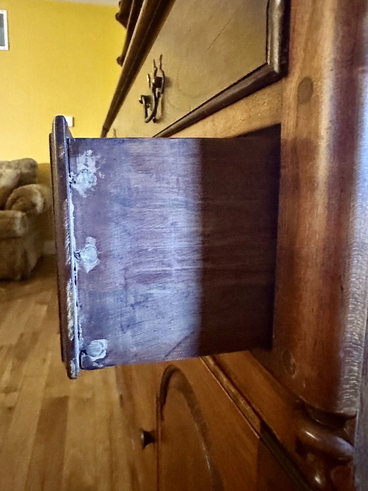 Items include LA-Z Boy remote control electric leather recliner; Chris Madden for JCPenney 10 place settings stoneware; Early American style matching pair of solid cherry wood hutch; American Colonial-Revival style drop-leaf server/console; vintage cherry drop-leaf dining table w/leaves, Queen Anne feet; tapestry sofa bed & love seat; four-piece Mediterranean bedroom set; Broyhill suede-like overstuffed love seat; metal lamp; vintage wall mirror & more. Items are located in Highland, NY.