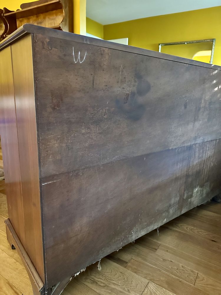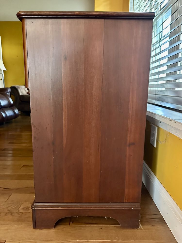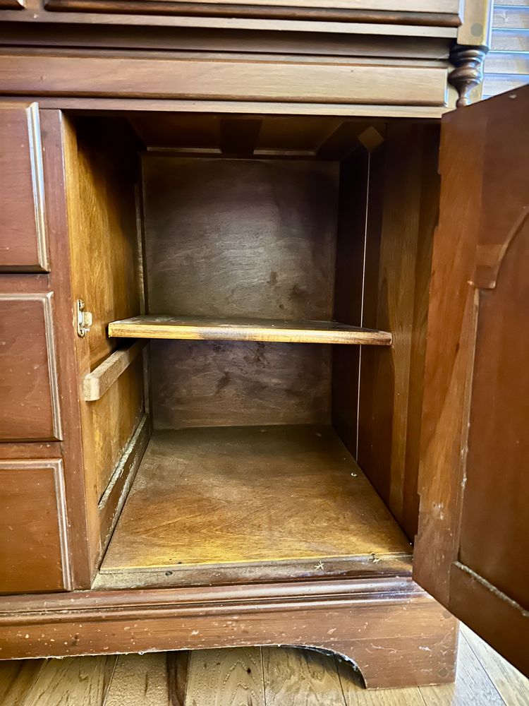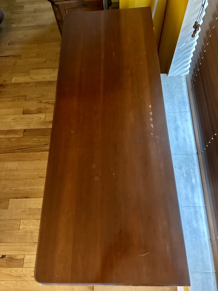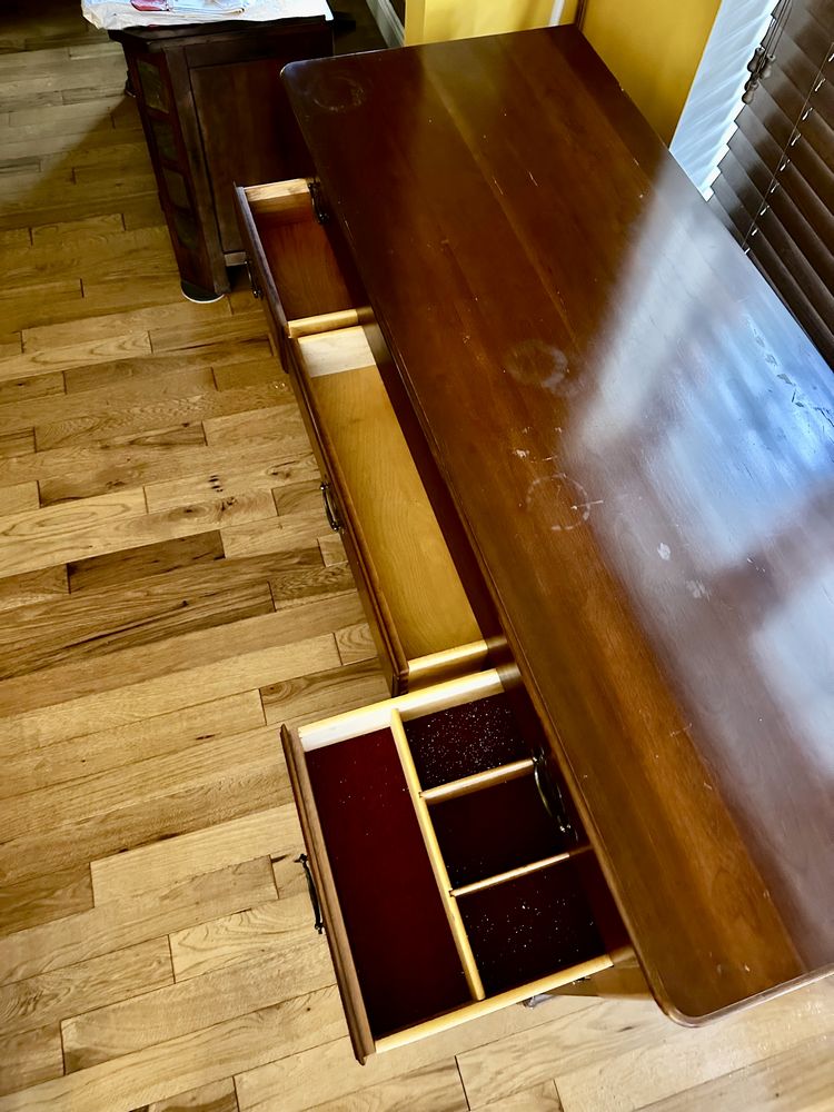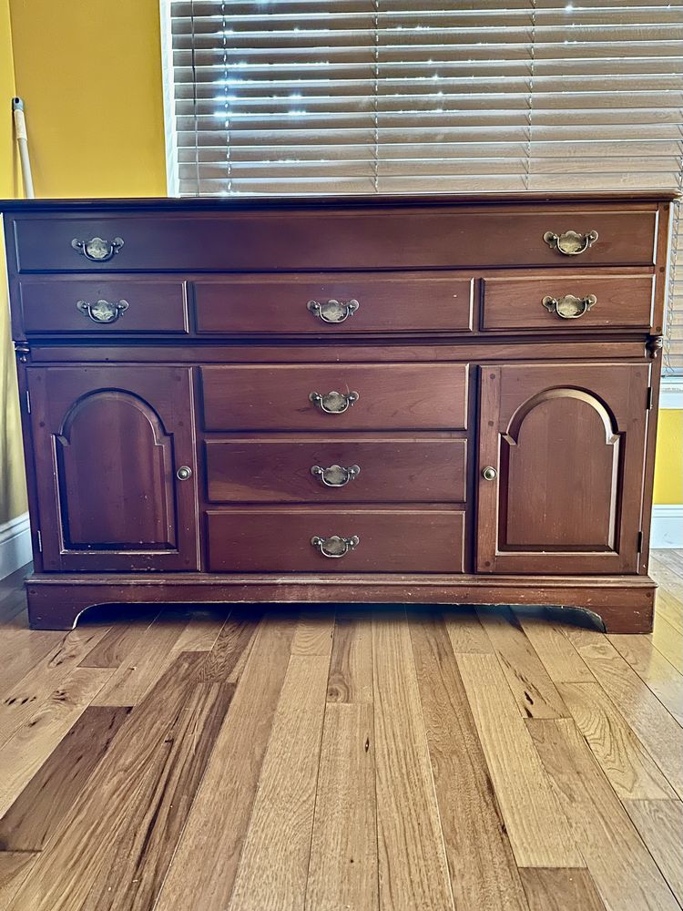 Early American style sideboard / buffet solid cherry wood with 7 drawers and 2 storage shelves. Incl. built-in silverware drawer. Dovetail joinery. This is a weighty piece of furniture that will give your home many years of useful service. (L 53.5 x W 20 x H 36)