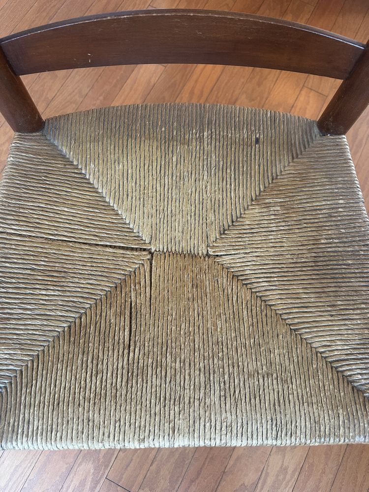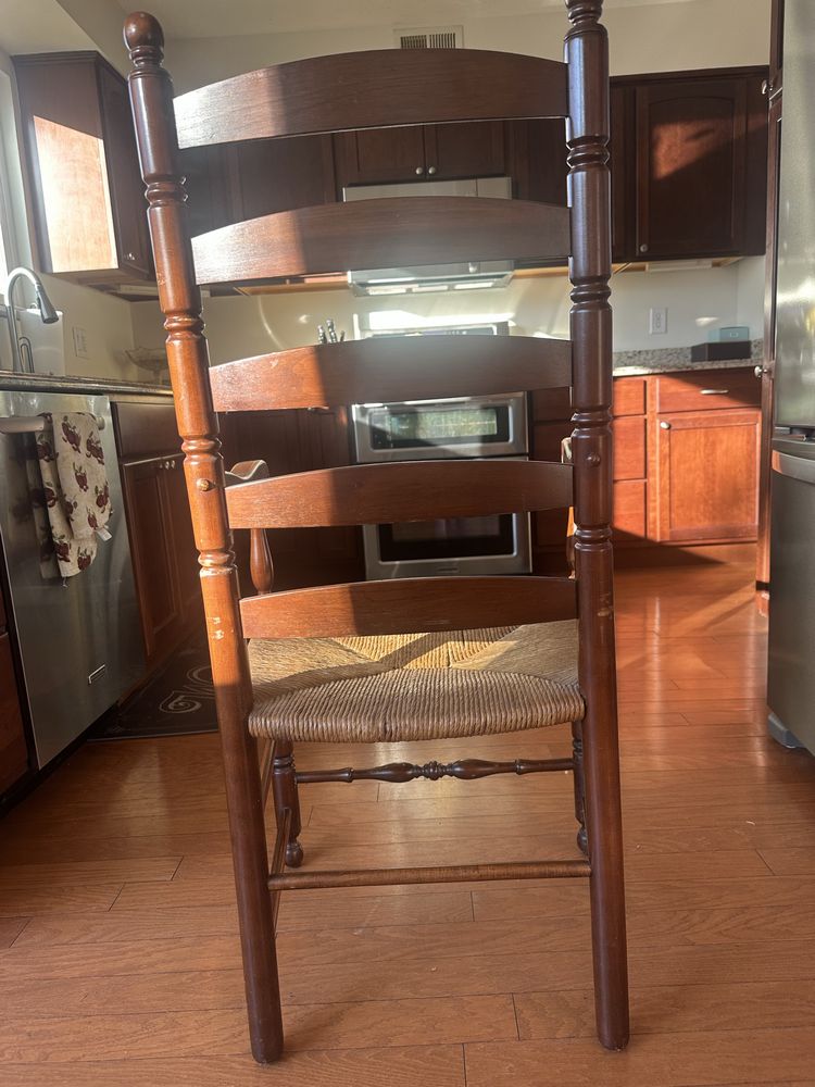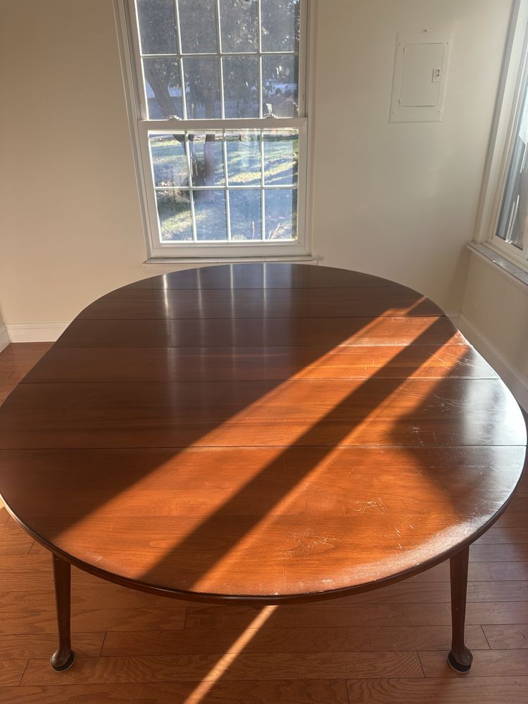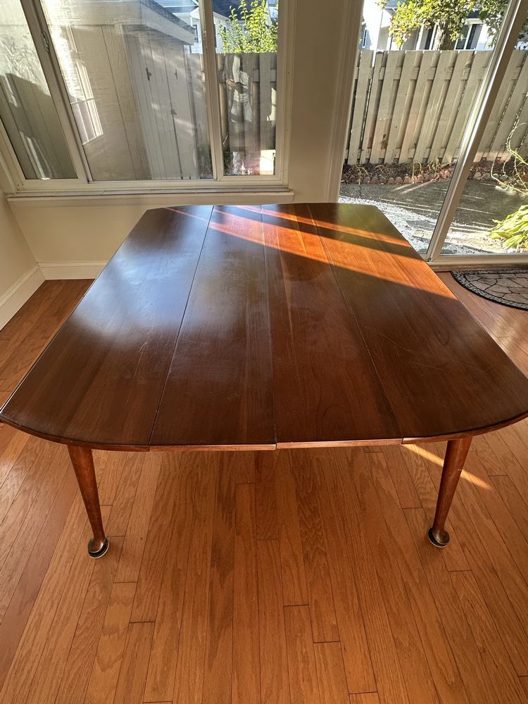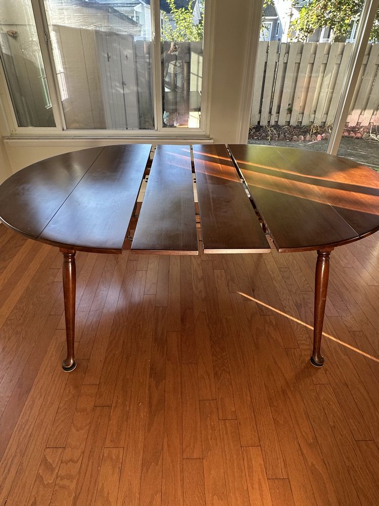 Vintage cherry drop-leaf dining table w/leaves, Queen Anne feet. 2 captain/4 side rush-seat chairs L 6’1” x W 54 1/4”