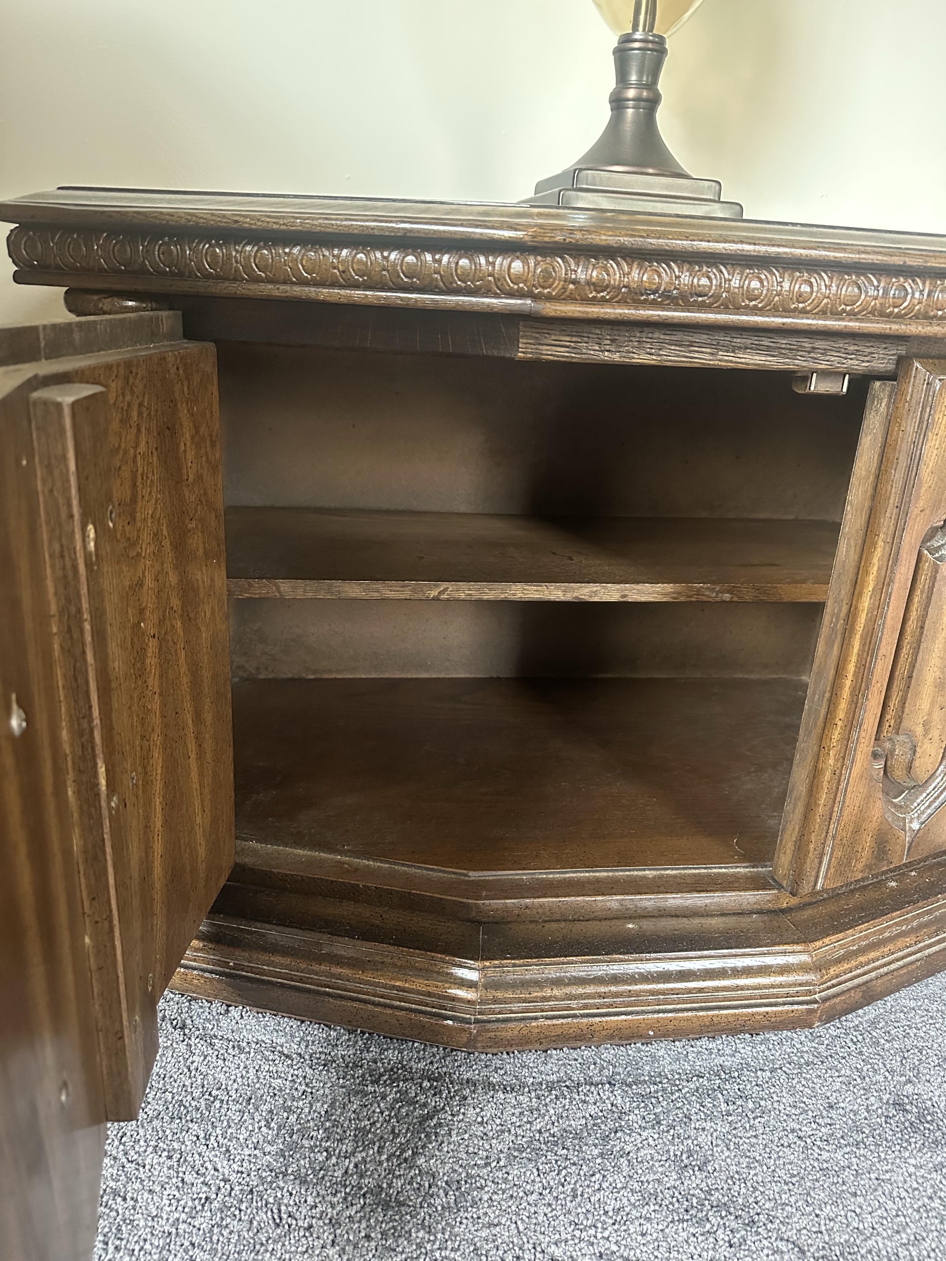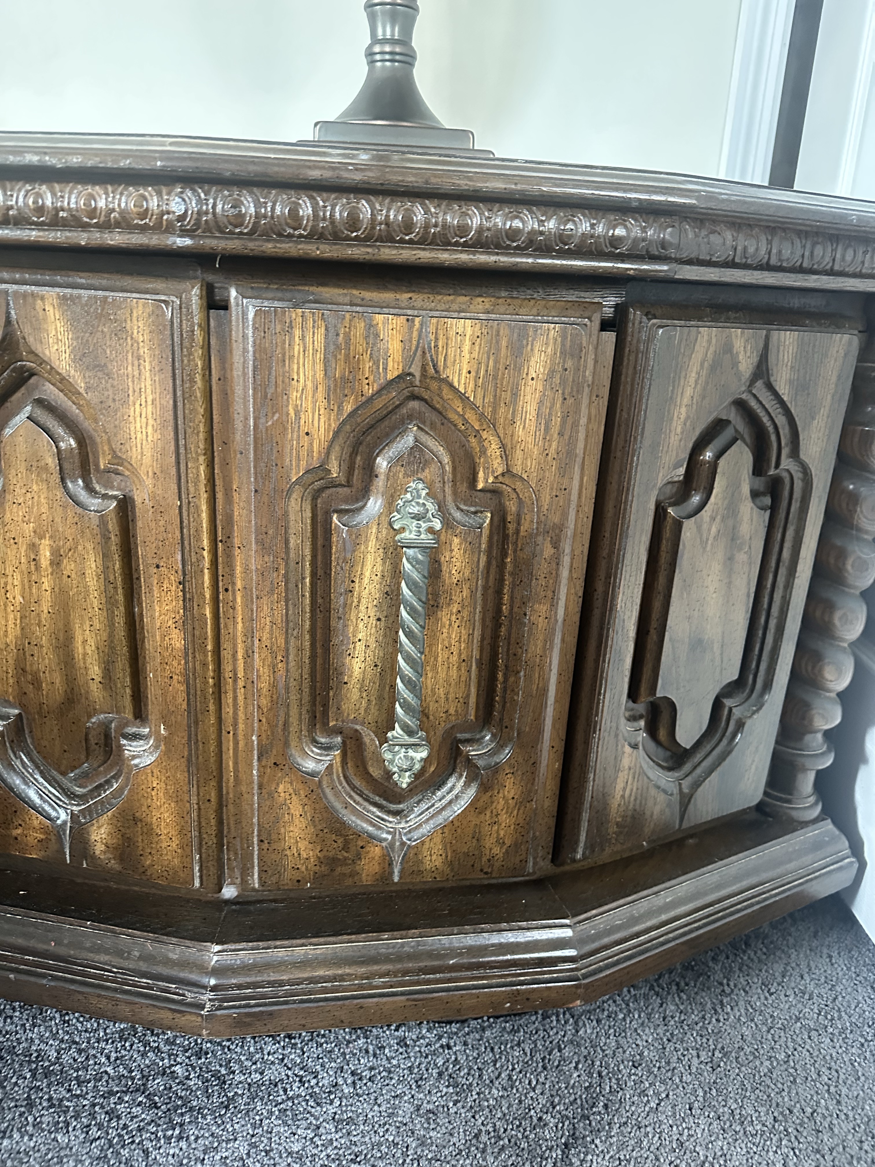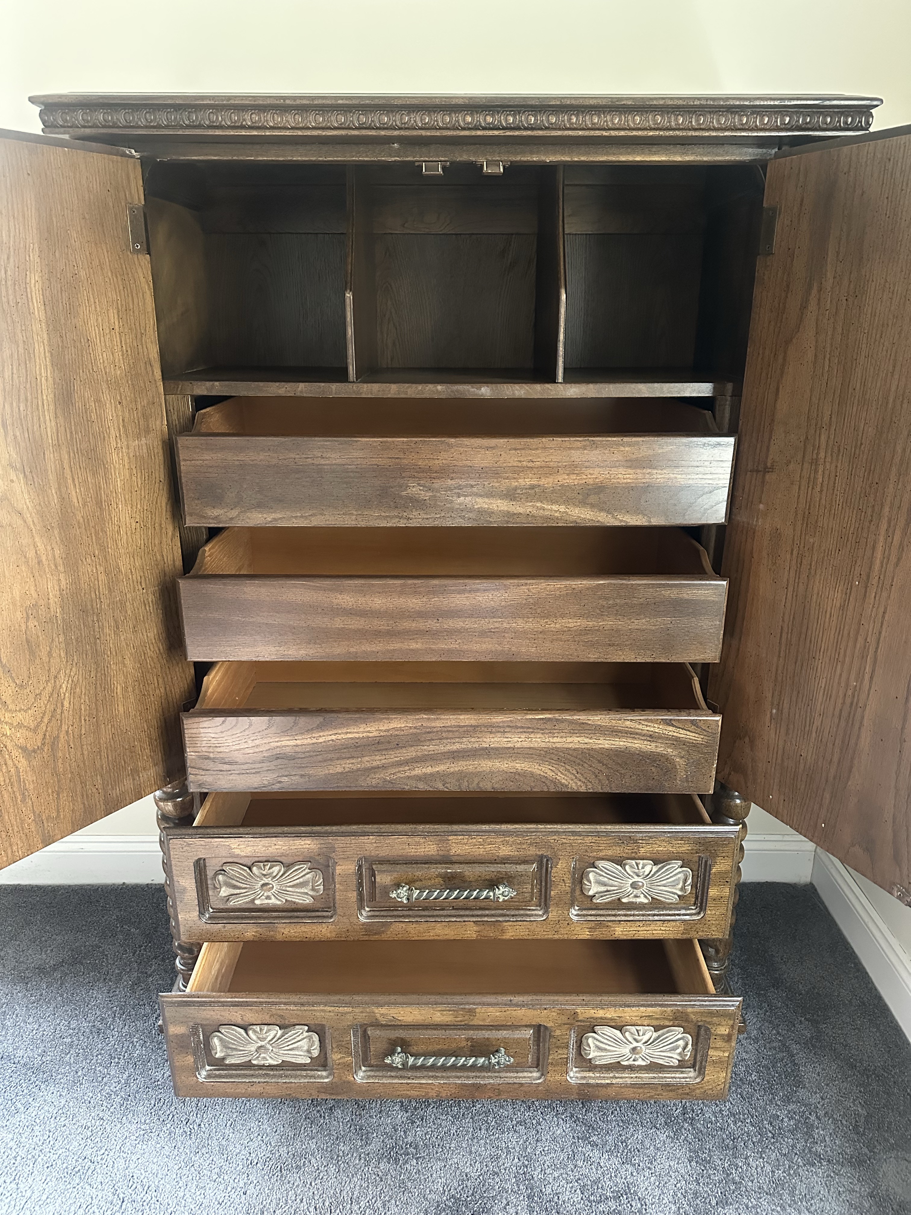 4-piece Mediterranean Bedroom set includes an armoire, two nightstands, and a headboard. Box spring and bed frame included (no mattress) Armoire measurements are H 61 x W 40 x D 18. Nightstands measure H 29 x W 32.5 x D 17.5