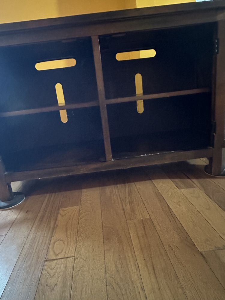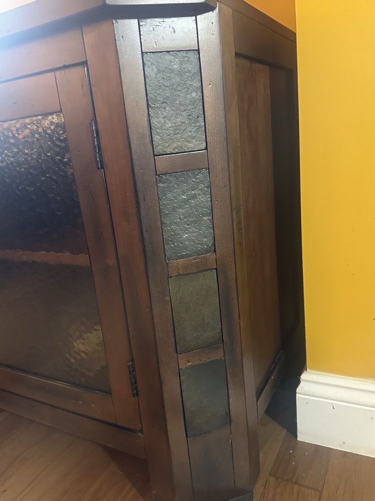Wooden Television Cabinet.2 doors, 4 shelves. W 45 1/4 x D 18 x H 27 1/4. Angled sides with faux stone accents. Doors have quality frosted see through panels. Beautiful and functional piece of furniture.