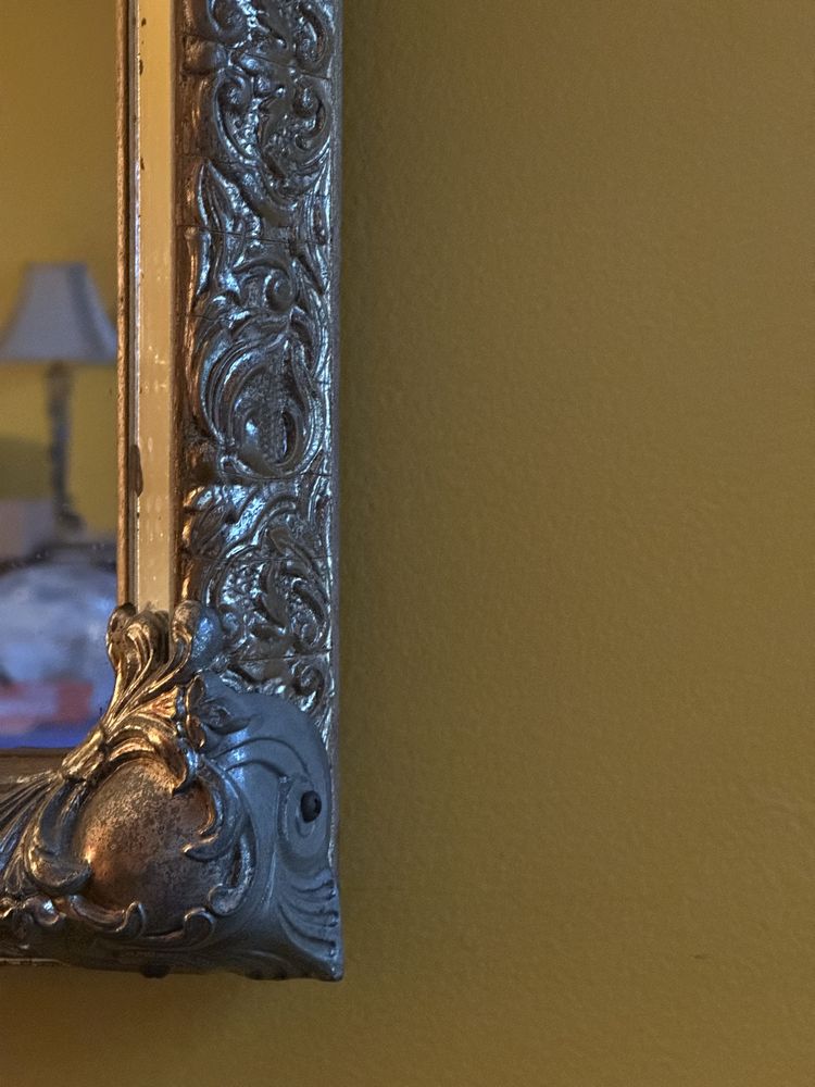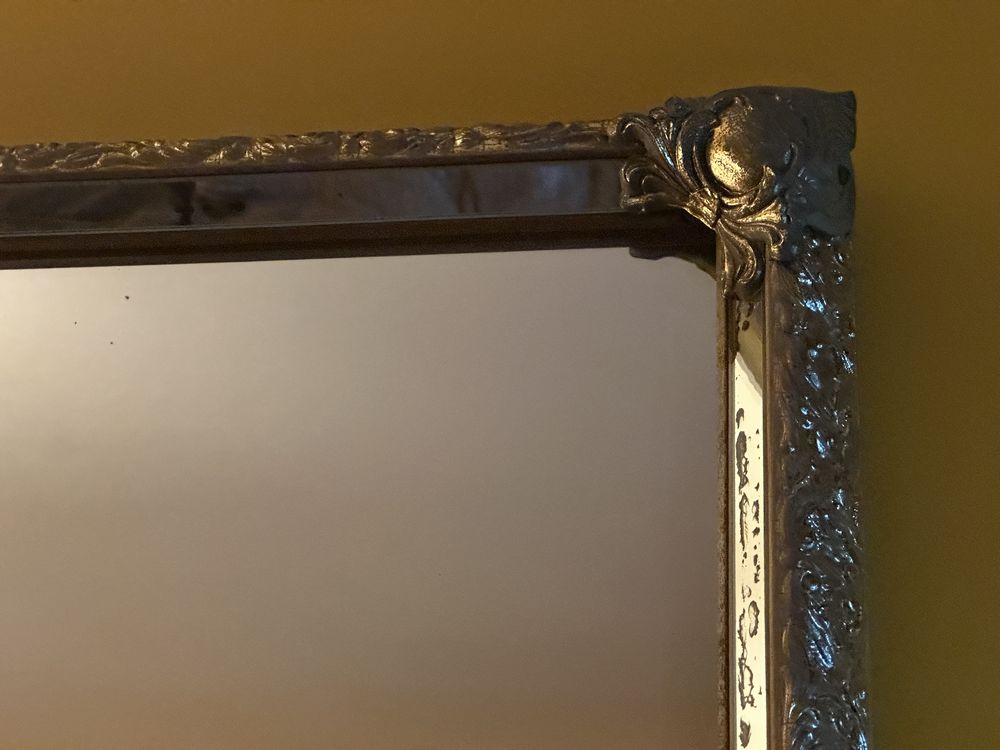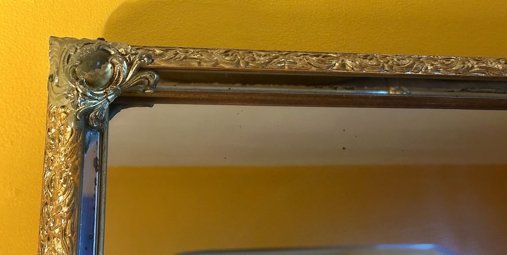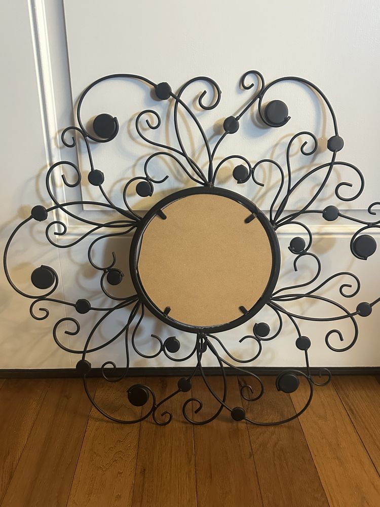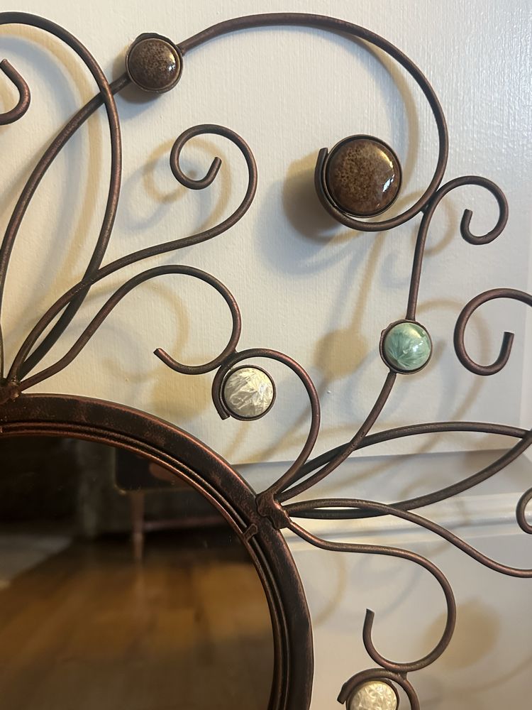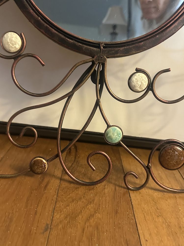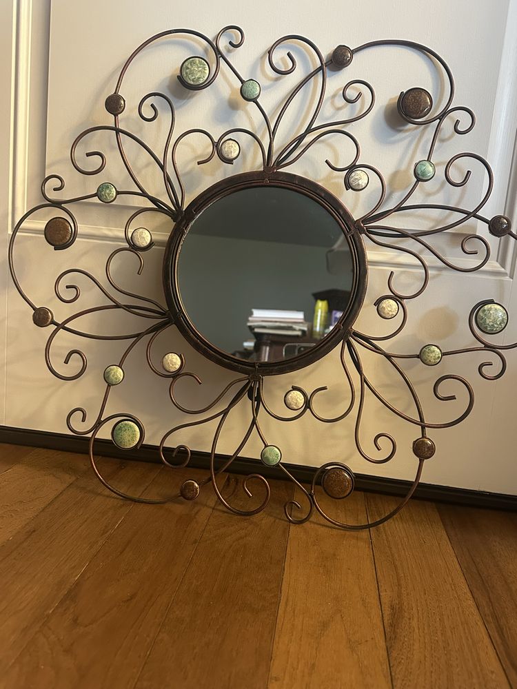 Vintage wall mirror with wood overlay. Beveled mirror sides. Some wood overlays are missing. Approximate H 33 x W 44. Plus modern decorative round metal mirror with enamel accents. W 20 x H 22.5