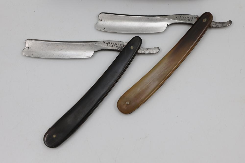 Pair of Straight Razors marked Warranted Razors having horn handles and notched Sheffield-style blades, including a two slot wedge case. See photos for details. Pickup only.