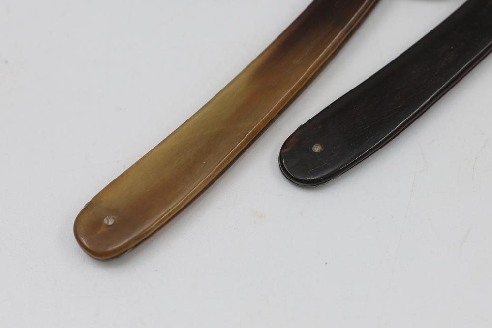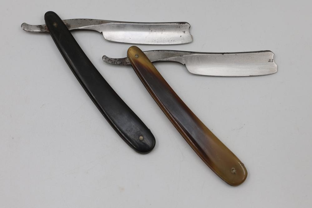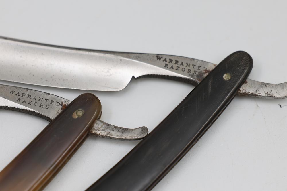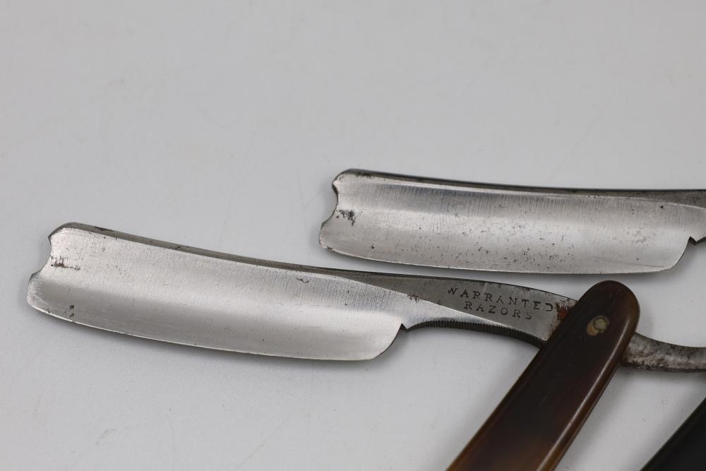 Items are from one straight razor collection & include cased matched pair of Joseph Rodgers & Sons straight razors having etched blade panels in velvet-lined Rodgers fitted case; Texas Luggage U.S. military style portable barber kit; porcelain shaving mugs with four lather brushes, collapsible compact travel shaving mirror with bowl; Warranted Razors having horn handles & notched Sheffield-style blades, etched Washington commemorative hollow blade with patriotic motif; Frederick Reynolds Sheffield straight razors; razors w/ mother of pearl scales/inlaid bar escutcheons/silver tone end caps/wedge-style blades; razors from Rogers & Sons, Wade & Butcher & Mappin's, featuring two horn scales & one celluloid with wedge style blades; razors from Clauss, J.A. Henckels, & H. Boker & Co., featuring mixed celluloid scales with hollow blades/includes multiple cases; barber Accessories including razor strops/sharpening stones/boxed Schick blades & more. Items are located in Pleasant Valley, NY.