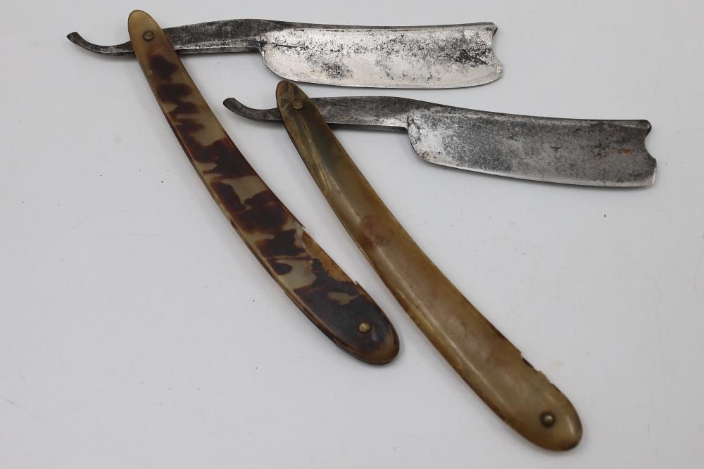Items are from one straight razor collection & include cased matched pair of Joseph Rodgers & Sons straight razors having etched blade panels in velvet-lined Rodgers fitted case; Texas Luggage U.S. military style portable barber kit; porcelain shaving mugs with four lather brushes, collapsible compact travel shaving mirror with bowl; Warranted Razors having horn handles & notched Sheffield-style blades, etched Washington commemorative hollow blade with patriotic motif; Frederick Reynolds Sheffield straight razors; razors w/ mother of pearl scales/inlaid bar escutcheons/silver tone end caps/wedge-style blades; razors from Rogers & Sons, Wade & Butcher & Mappin's, featuring two horn scales & one celluloid with wedge style blades; razors from Clauss, J.A. Henckels, & H. Boker & Co., featuring mixed celluloid scales with hollow blades/includes multiple cases; barber Accessories including razor strops/sharpening stones/boxed Schick blades & more. Items are located in Pleasant Valley, NY.