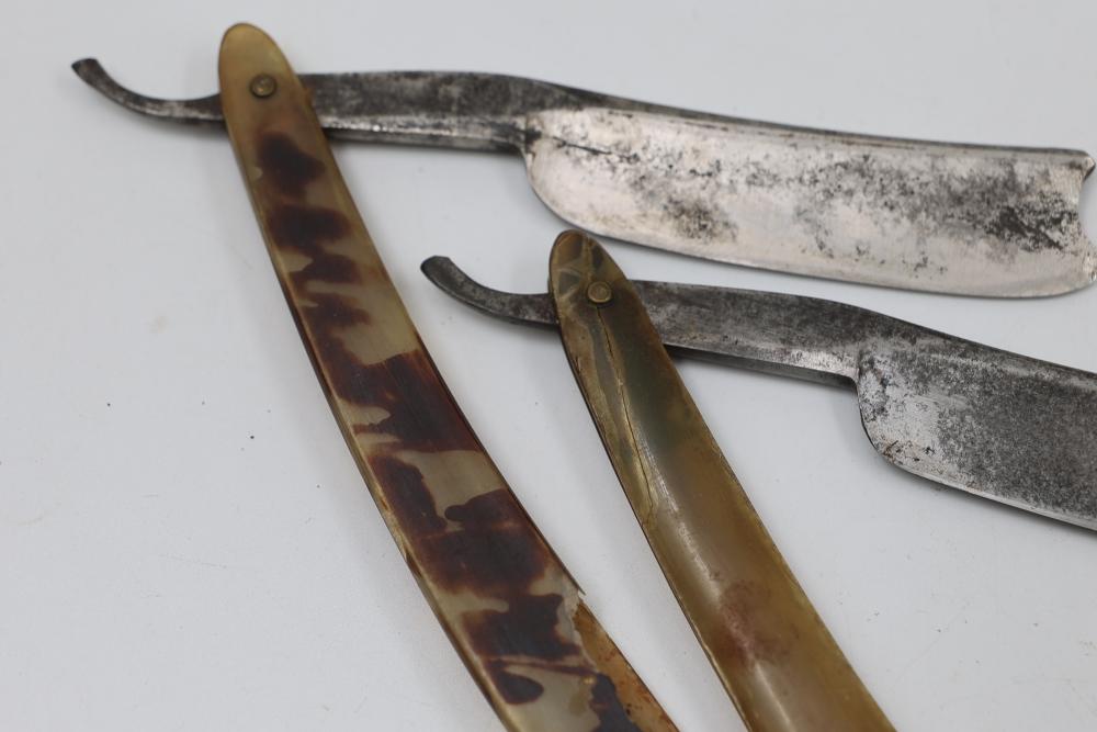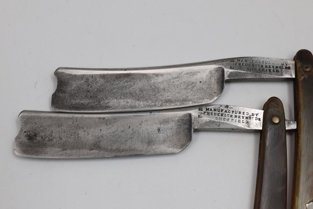 Four Frederick Reynolds Sheffield Straight Razors having horn and composite scales with notched wedge blades. Includes two formed cases. See photos for details. Pickup only.