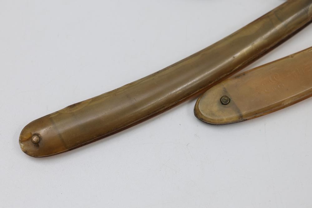 Items are from one straight razor collection & include cased matched pair of Joseph Rodgers & Sons straight razors having etched blade panels in velvet-lined Rodgers fitted case; Texas Luggage U.S. military style portable barber kit; porcelain shaving mugs with four lather brushes, collapsible compact travel shaving mirror with bowl; Warranted Razors having horn handles & notched Sheffield-style blades, etched Washington commemorative hollow blade with patriotic motif; Frederick Reynolds Sheffield straight razors; razors w/ mother of pearl scales/inlaid bar escutcheons/silver tone end caps/wedge-style blades; razors from Rogers & Sons, Wade & Butcher & Mappin's, featuring two horn scales & one celluloid with wedge style blades; razors from Clauss, J.A. Henckels, & H. Boker & Co., featuring mixed celluloid scales with hollow blades/includes multiple cases; barber Accessories including razor strops/sharpening stones/boxed Schick blades & more. Items are located in Pleasant Valley, NY.