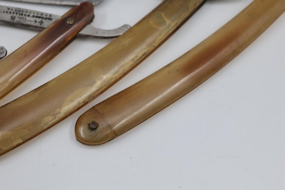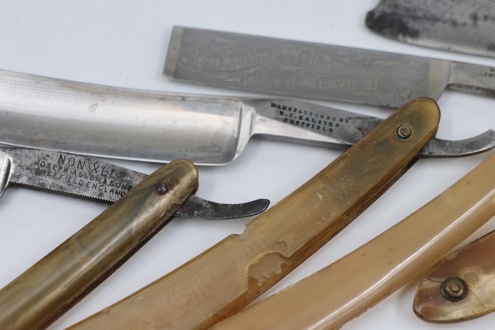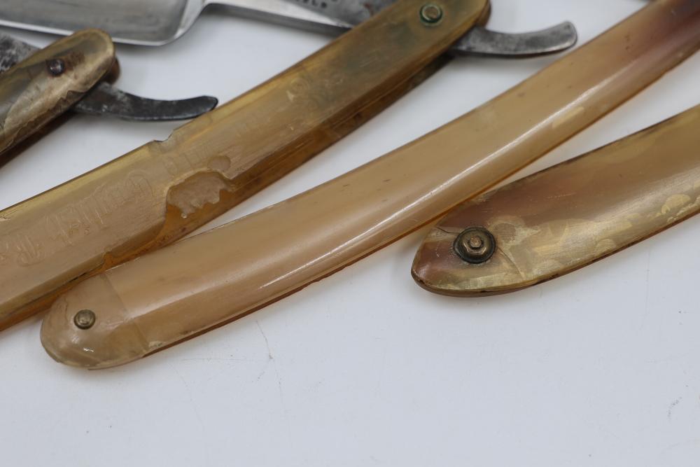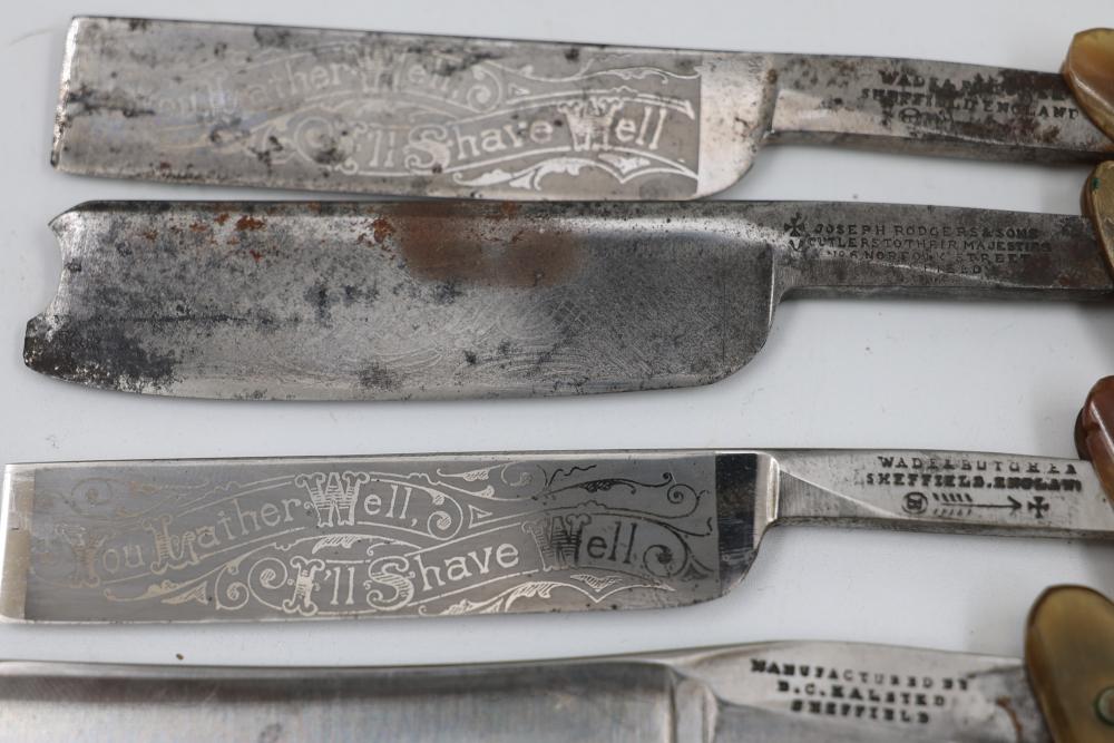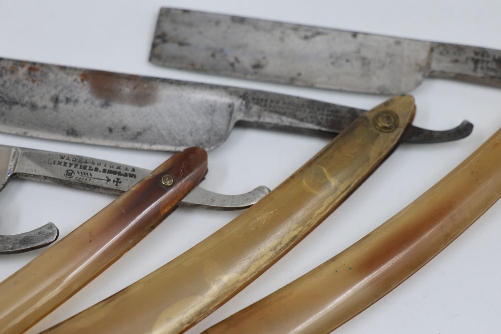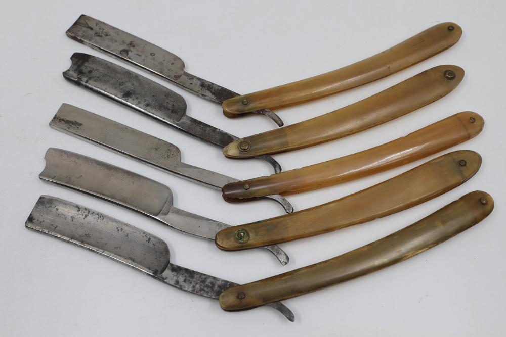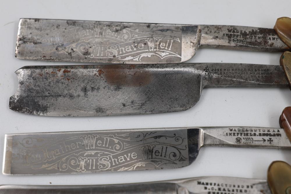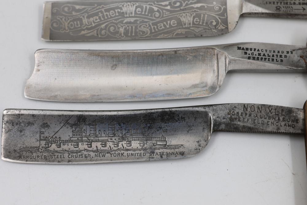 Five Straight Razors from makers such as Wade & Butcher, Joseph Allen, and Joseph Rodgers, featuring etched patriotic and naval blade motifs, each fitted with horn scales, with mixed wedge and hollow baldes. See photos for details. Pickup only.