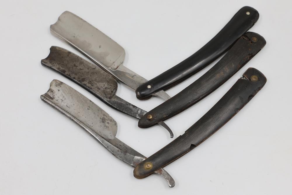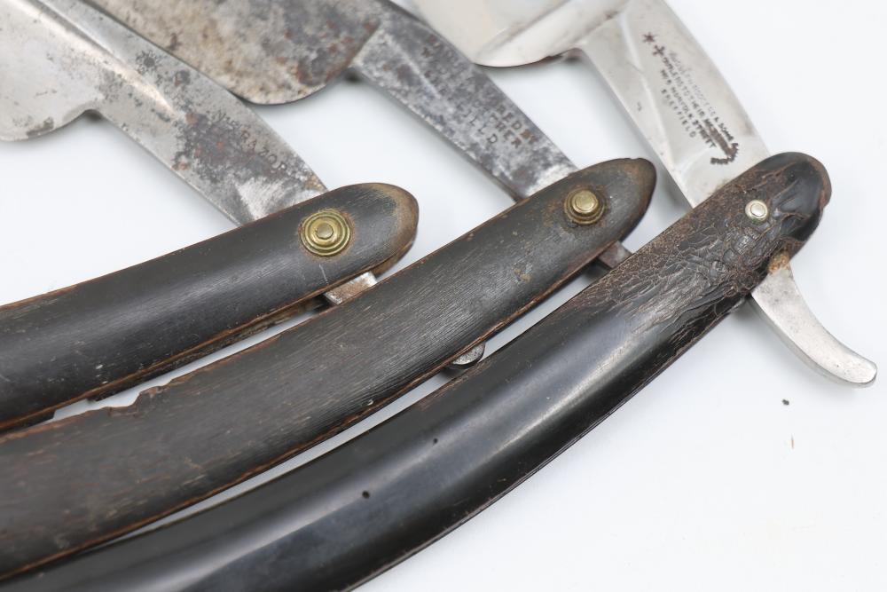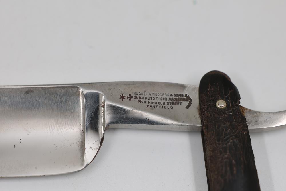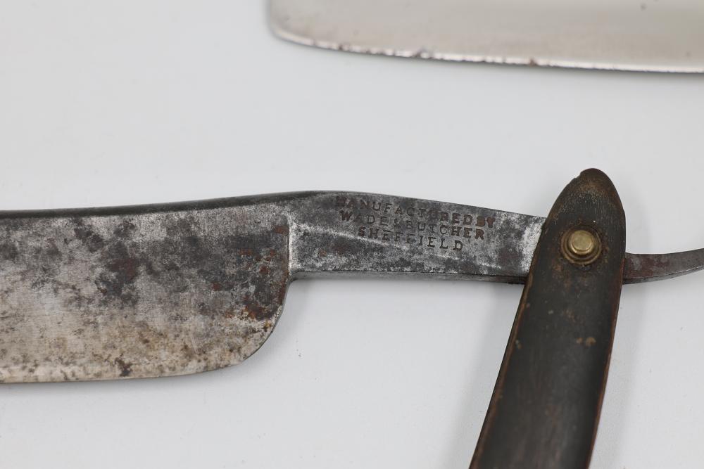 Items are from one straight razor collection & include cased matched pair of Joseph Rodgers & Sons straight razors having etched blade panels in velvet-lined Rodgers fitted case; Texas Luggage U.S. military style portable barber kit; porcelain shaving mugs with four lather brushes, collapsible compact travel shaving mirror with bowl; Warranted Razors having horn handles & notched Sheffield-style blades, etched Washington commemorative hollow blade with patriotic motif; Frederick Reynolds Sheffield straight razors; razors w/ mother of pearl scales/inlaid bar escutcheons/silver tone end caps/wedge-style blades; razors from Rogers & Sons, Wade & Butcher & Mappin's, featuring two horn scales & one celluloid with wedge style blades; razors from Clauss, J.A. Henckels, & H. Boker & Co., featuring mixed celluloid scales with hollow blades/includes multiple cases; barber Accessories including razor strops/sharpening stones/boxed Schick blades & more. Items are located in Pleasant Valley, NY.