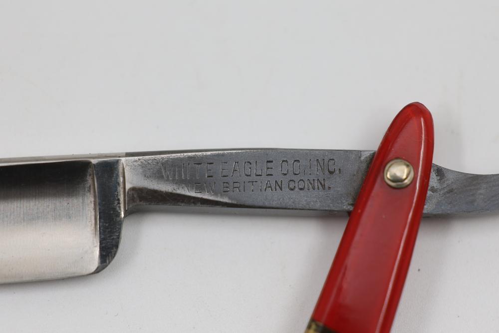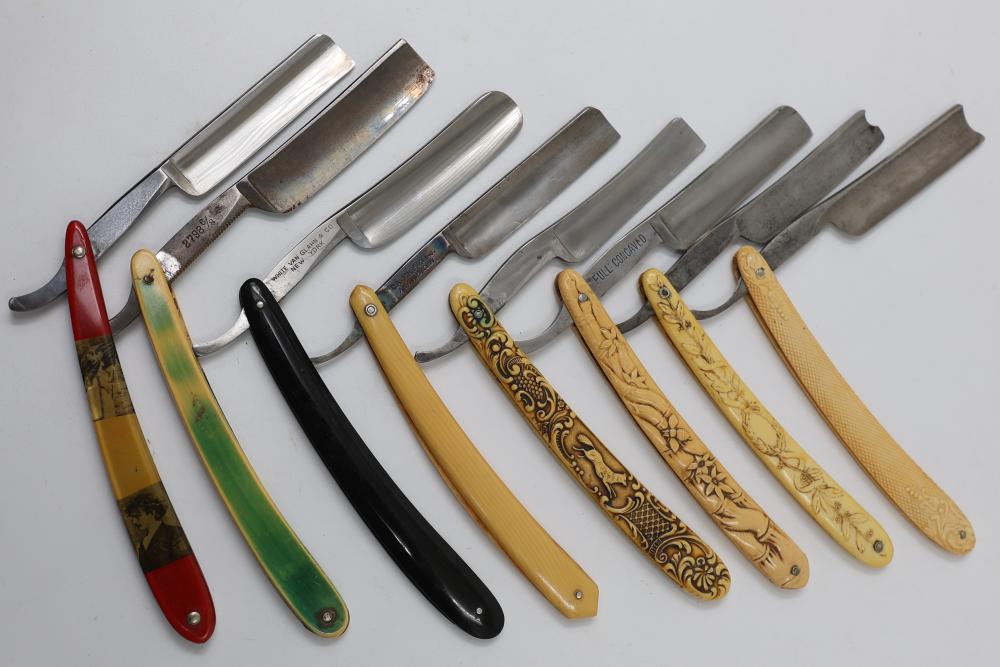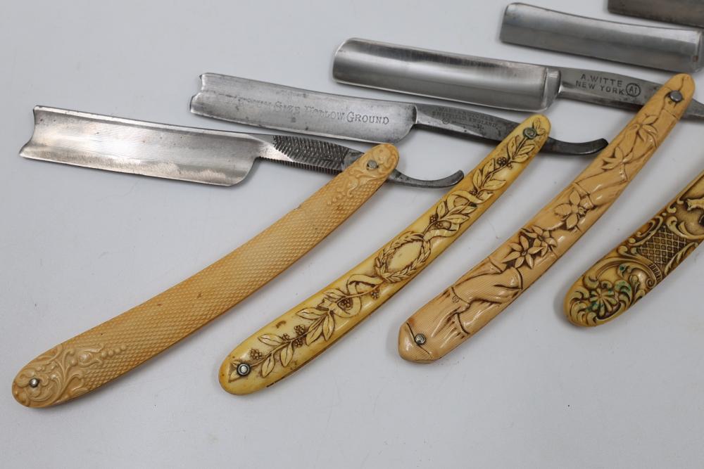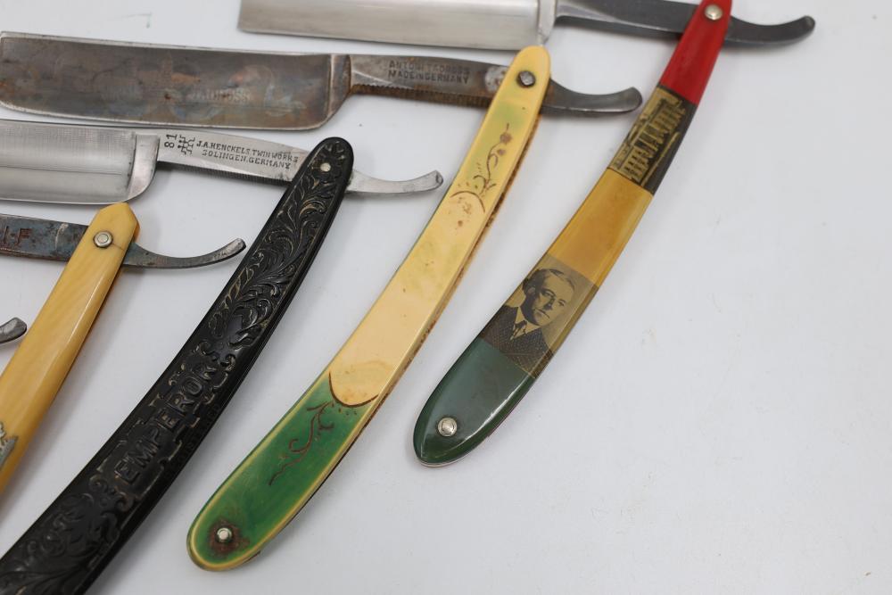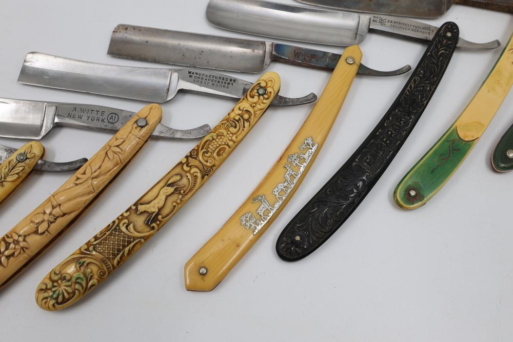 Eight Straight Razors from makers such as A. Witte, Antoni Tadross, and Wade & Butcher, featuring decorative celluloid handles with embossed and carved designs. Mixed full and hollow blades, some with etched eagle and scenic motifs. See photos for details. Pickup only.