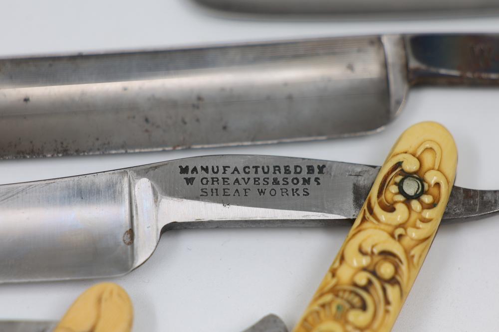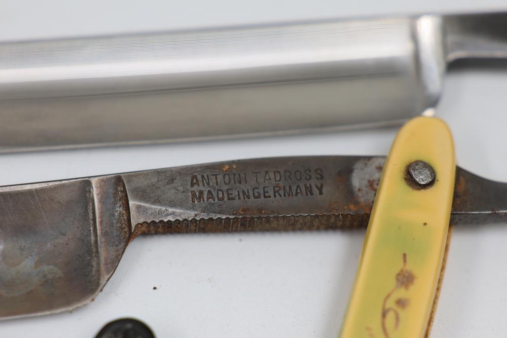 Items are from one straight razor collection & include cased matched pair of Joseph Rodgers & Sons straight razors having etched blade panels in velvet-lined Rodgers fitted case; Texas Luggage U.S. military style portable barber kit; porcelain shaving mugs with four lather brushes, collapsible compact travel shaving mirror with bowl; Warranted Razors having horn handles & notched Sheffield-style blades, etched Washington commemorative hollow blade with patriotic motif; Frederick Reynolds Sheffield straight razors; razors w/ mother of pearl scales/inlaid bar escutcheons/silver tone end caps/wedge-style blades; razors from Rogers & Sons, Wade & Butcher & Mappin's, featuring two horn scales & one celluloid with wedge style blades; razors from Clauss, J.A. Henckels, & H. Boker & Co., featuring mixed celluloid scales with hollow blades/includes multiple cases; barber Accessories including razor strops/sharpening stones/boxed Schick blades & more. Items are located in Pleasant Valley, NY.