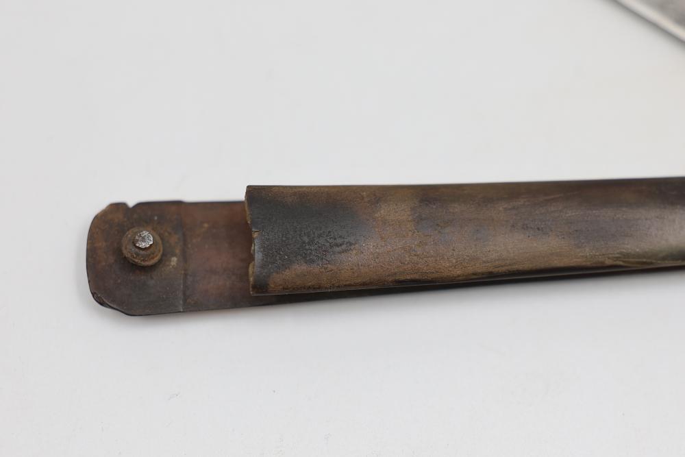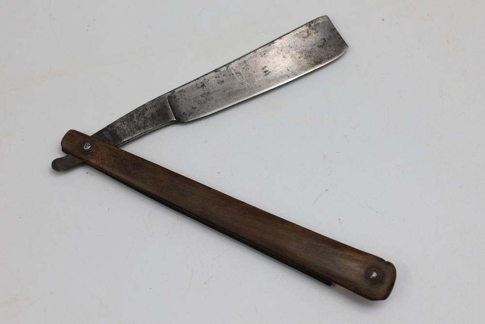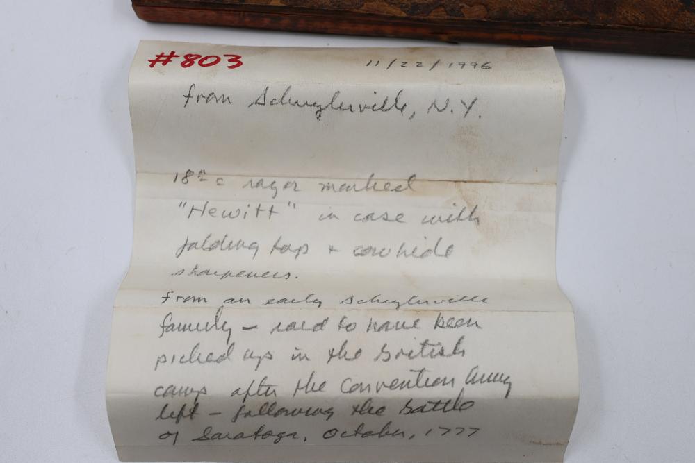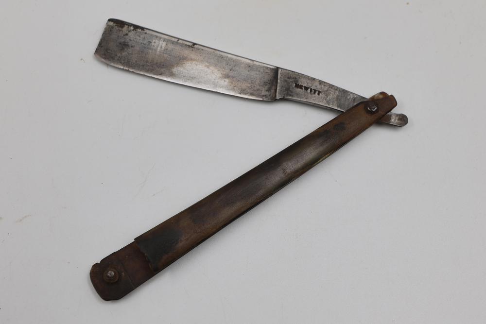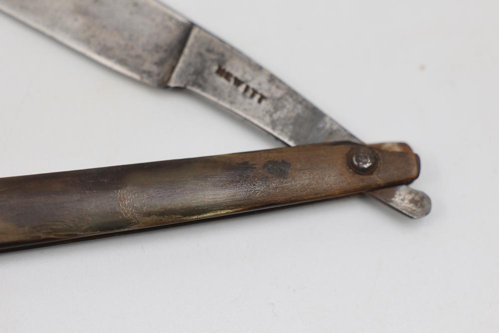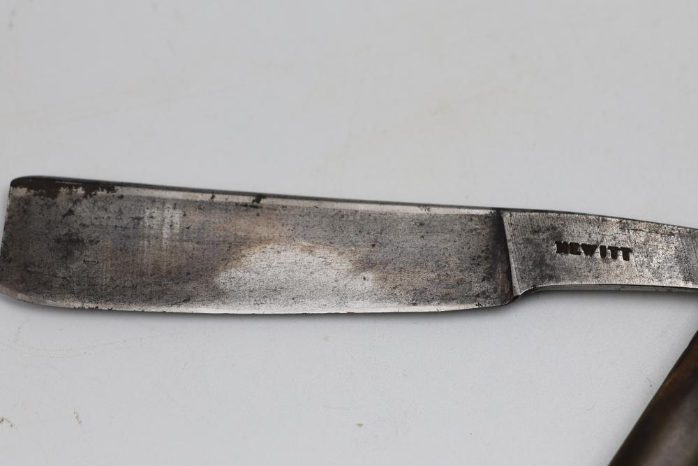Straight Razor marked Hewitt with dark horn scale and a wedge style blade. Includes slide-top case. See photos for details. Pickup only.