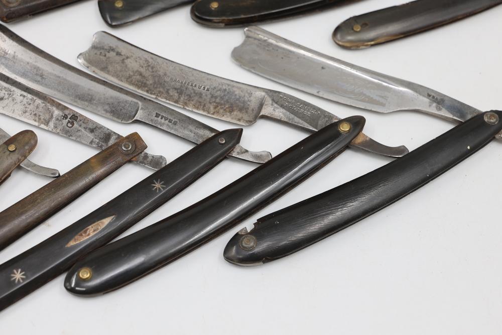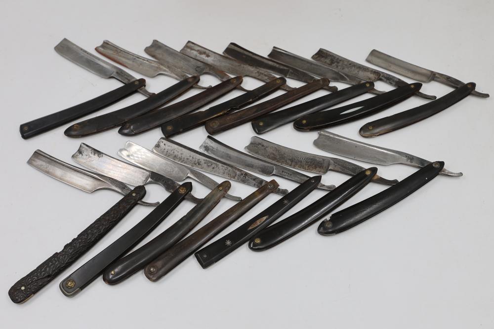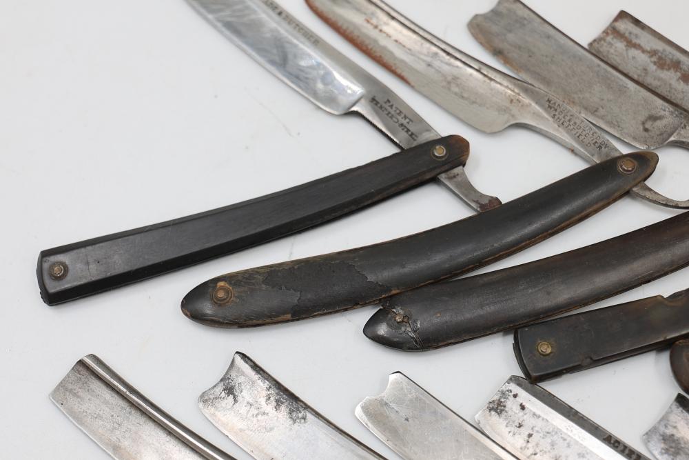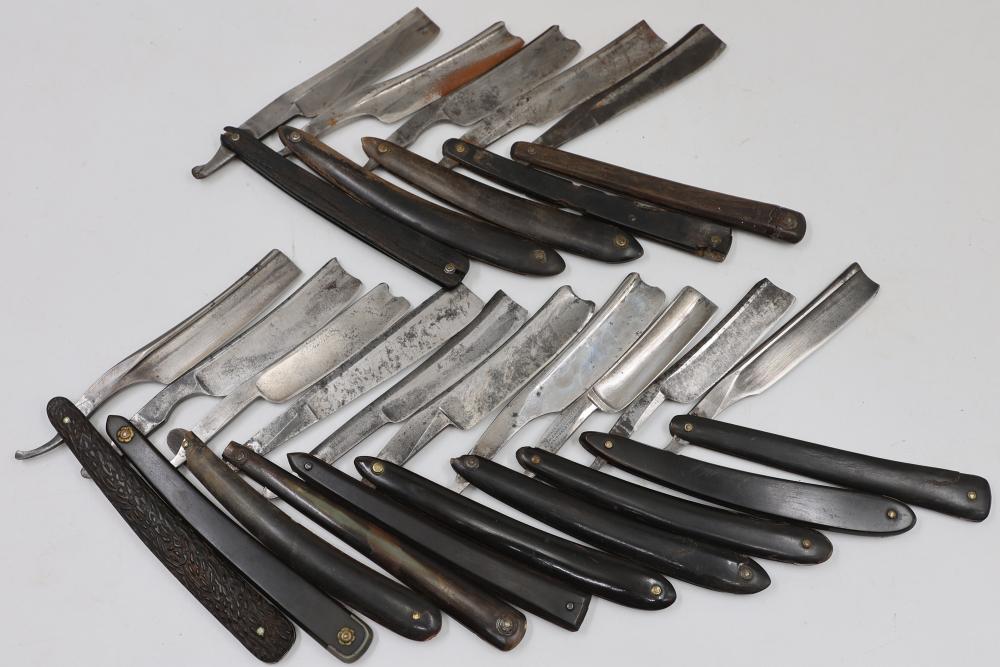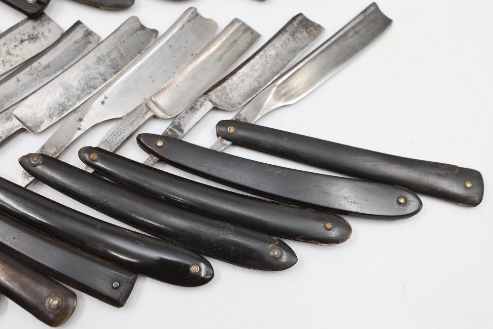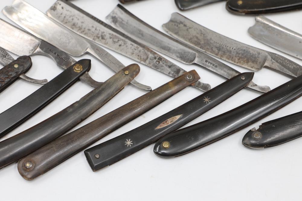 Items are from one straight razor collection & include cased matched pair of Joseph Rodgers & Sons straight razors having etched blade panels in velvet-lined Rodgers fitted case; Texas Luggage U.S. military style portable barber kit; porcelain shaving mugs with four lather brushes, collapsible compact travel shaving mirror with bowl; Warranted Razors having horn handles & notched Sheffield-style blades, etched Washington commemorative hollow blade with patriotic motif; Frederick Reynolds Sheffield straight razors; razors w/ mother of pearl scales/inlaid bar escutcheons/silver tone end caps/wedge-style blades; razors from Rogers & Sons, Wade & Butcher & Mappin's, featuring two horn scales & one celluloid with wedge style blades; razors from Clauss, J.A. Henckels, & H. Boker & Co., featuring mixed celluloid scales with hollow blades/includes multiple cases; barber Accessories including razor strops/sharpening stones/boxed Schick blades & more. Items are located in Pleasant Valley, NY.