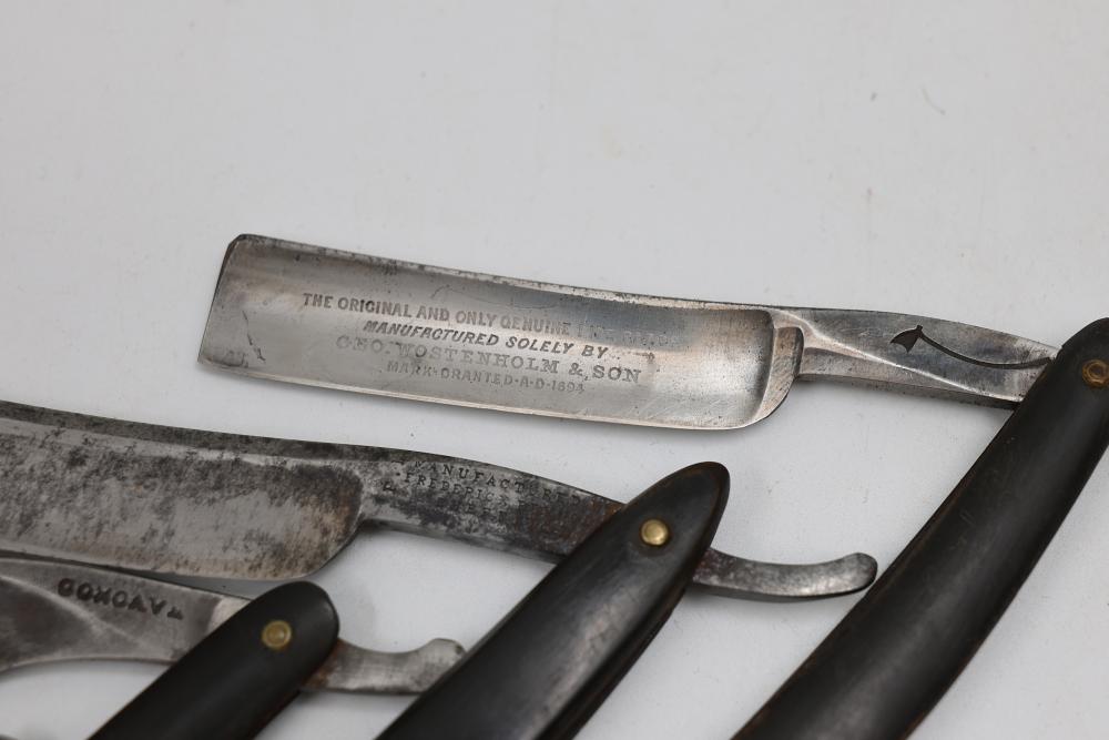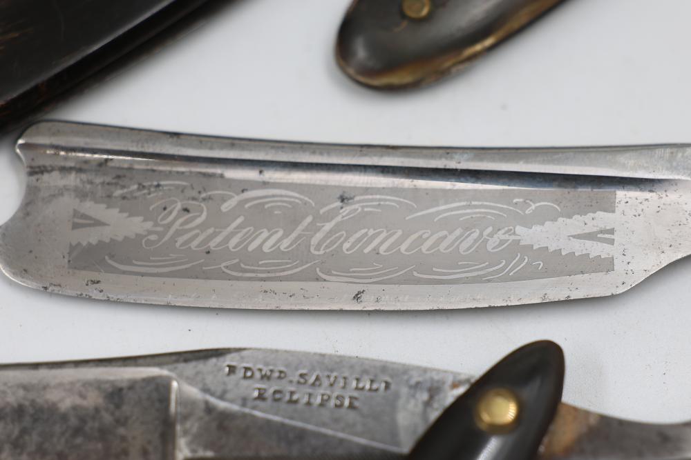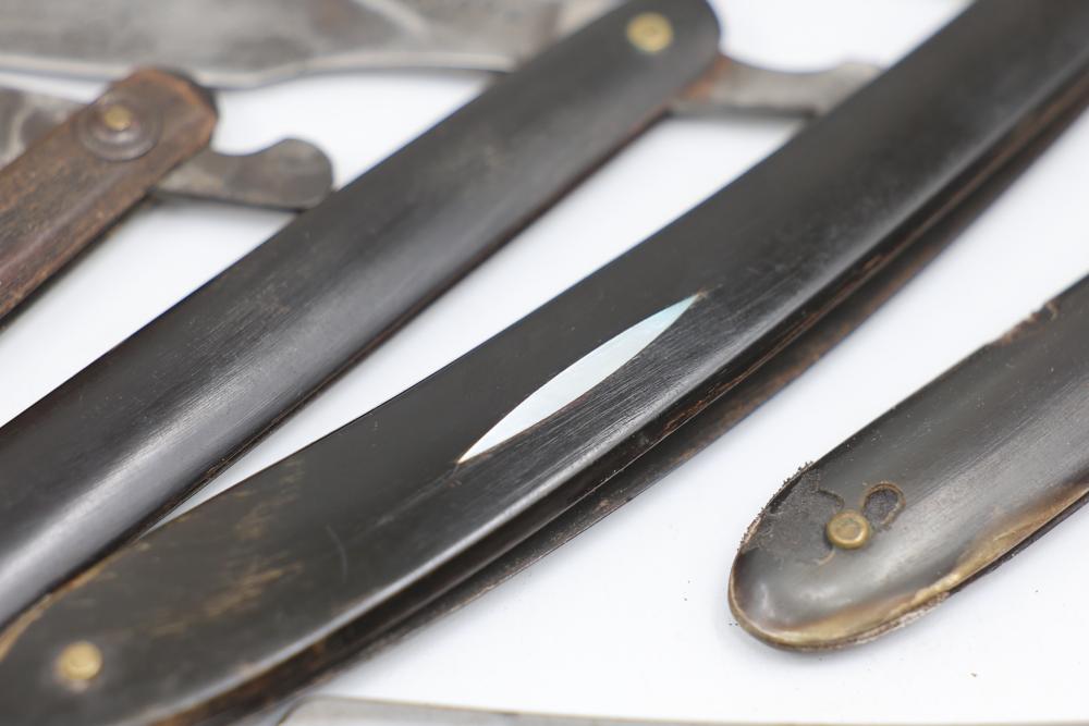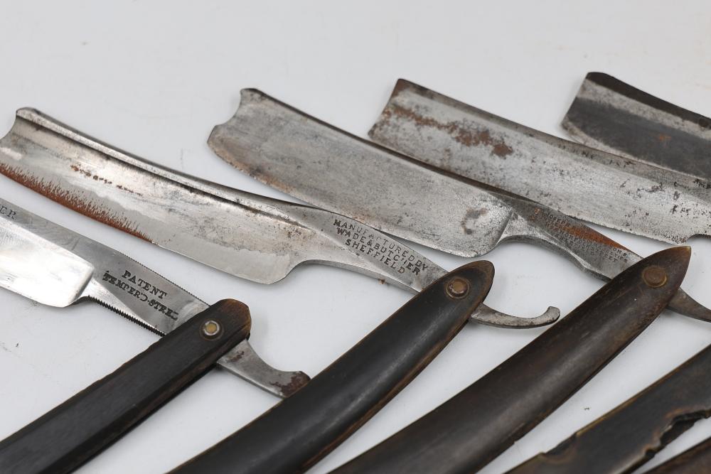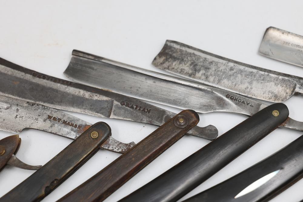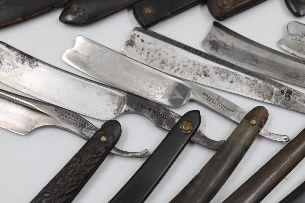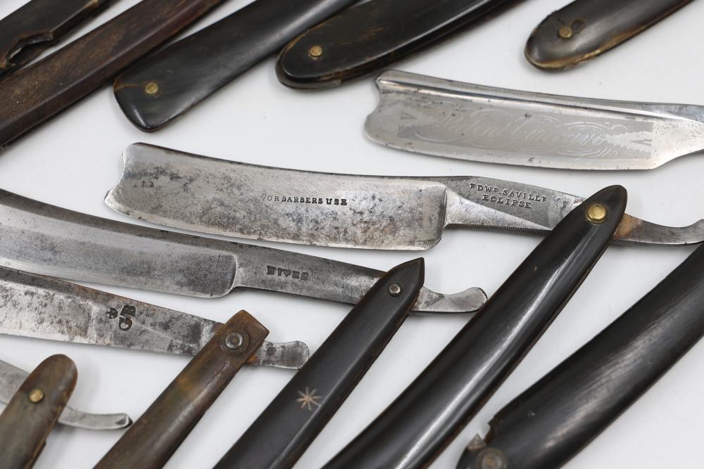 Items are from one straight razor collection & include cased matched pair of Joseph Rodgers & Sons straight razors having etched blade panels in velvet-lined Rodgers fitted case; Texas Luggage U.S. military style portable barber kit; porcelain shaving mugs with four lather brushes, collapsible compact travel shaving mirror with bowl; Warranted Razors having horn handles & notched Sheffield-style blades, etched Washington commemorative hollow blade with patriotic motif; Frederick Reynolds Sheffield straight razors; razors w/ mother of pearl scales/inlaid bar escutcheons/silver tone end caps/wedge-style blades; razors from Rogers & Sons, Wade & Butcher & Mappin's, featuring two horn scales & one celluloid with wedge style blades; razors from Clauss, J.A. Henckels, & H. Boker & Co., featuring mixed celluloid scales with hollow blades/includes multiple cases; barber Accessories including razor strops/sharpening stones/boxed Schick blades & more. Items are located in Pleasant Valley, NY.