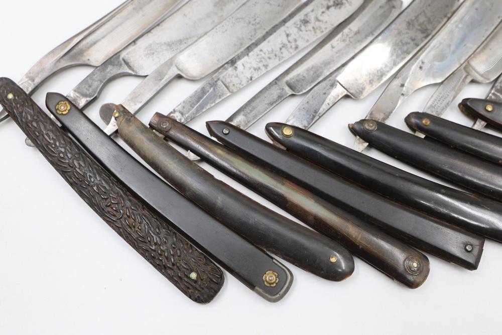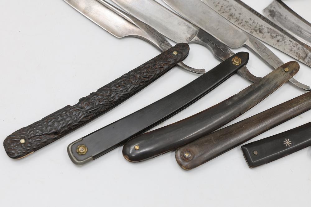 15 Straight Razors in a 15 day case from makers such as Frederick Reynolds, Packwood, Joseph Roger & Sons, featuring celluloid, wood, and horn scales, with mixed wedge and hollow style blades. See photos for details. Pickup only.