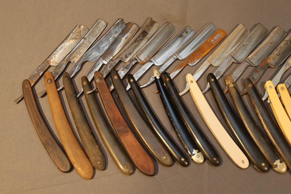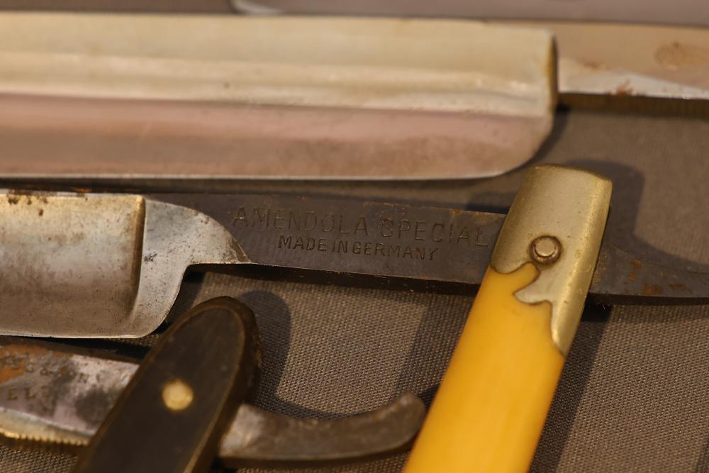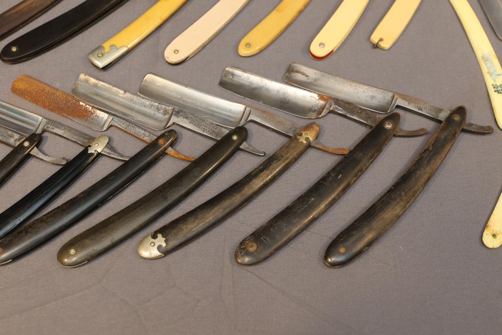 20 Straight Razors with makers marks such as Ontario Cutlery, Amendola Special, and Frederick Reynolds, featuring wood, horn, and celluloid scales, with mixed wedge style blades. See photos for details. Pickup only.