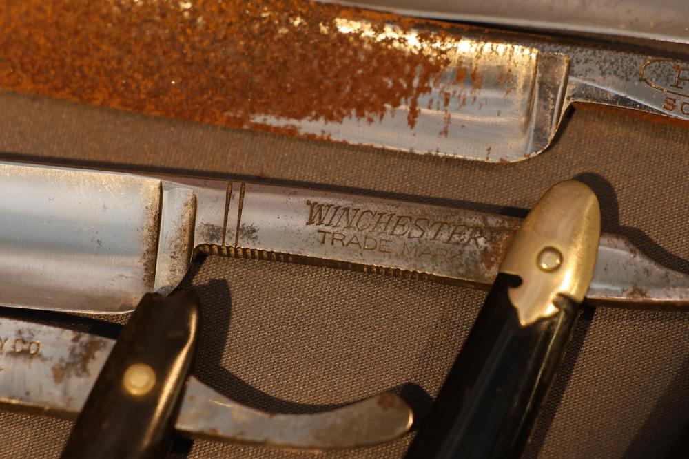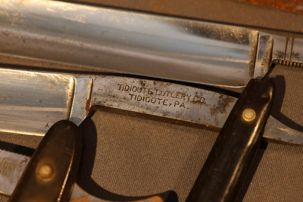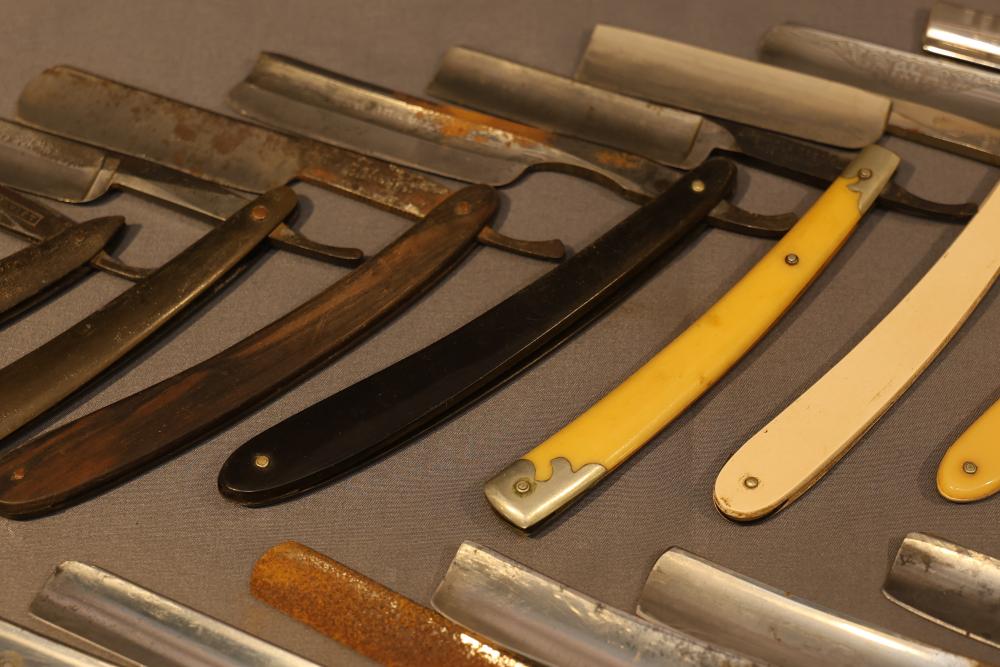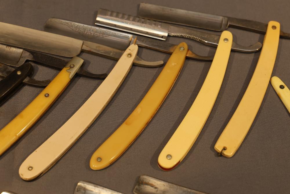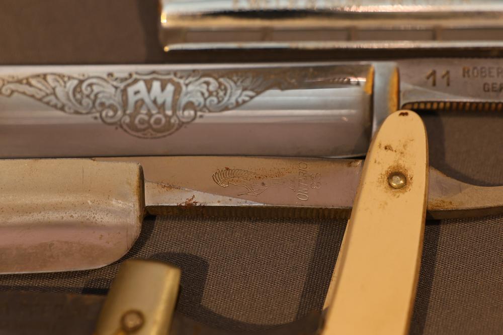 Items are from one straight razor collection & include cased matched pair of Joseph Rodgers & Sons straight razors having etched blade panels in velvet-lined Rodgers fitted case; Texas Luggage U.S. military style portable barber kit; porcelain shaving mugs with four lather brushes, collapsible compact travel shaving mirror with bowl; Warranted Razors having horn handles & notched Sheffield-style blades, etched Washington commemorative hollow blade with patriotic motif; Frederick Reynolds Sheffield straight razors; razors w/ mother of pearl scales/inlaid bar escutcheons/silver tone end caps/wedge-style blades; razors from Rogers & Sons, Wade & Butcher & Mappin's, featuring two horn scales & one celluloid with wedge style blades; razors from Clauss, J.A. Henckels, & H. Boker & Co., featuring mixed celluloid scales with hollow blades/includes multiple cases; barber Accessories including razor strops/sharpening stones/boxed Schick blades & more. Items are located in Pleasant Valley, NY.