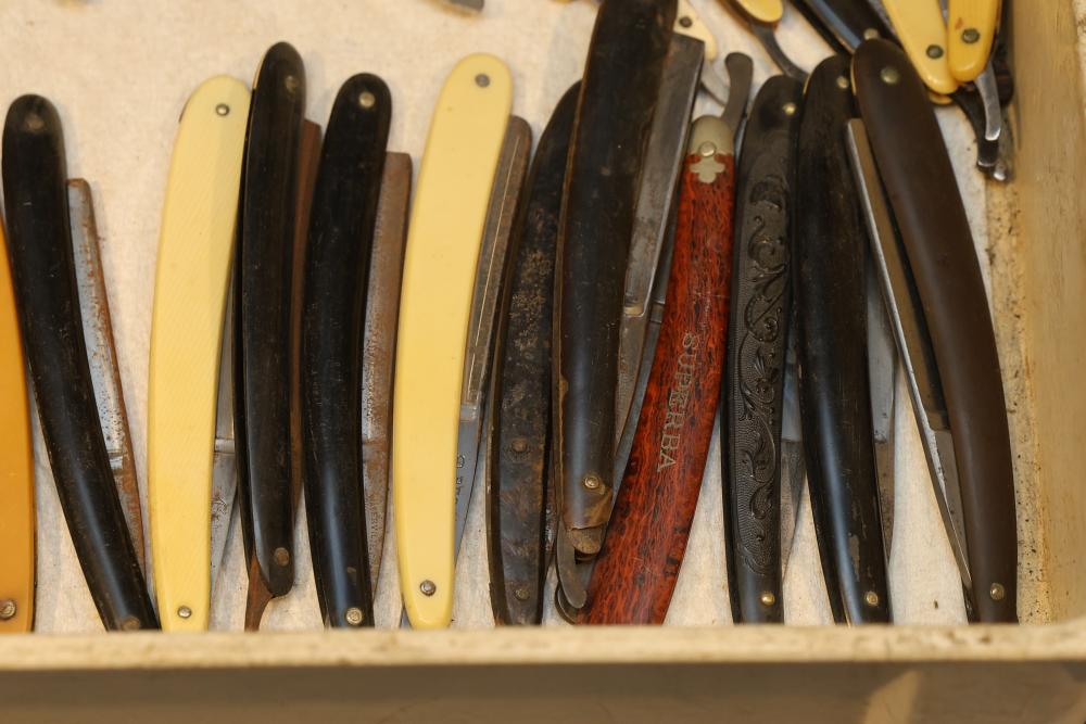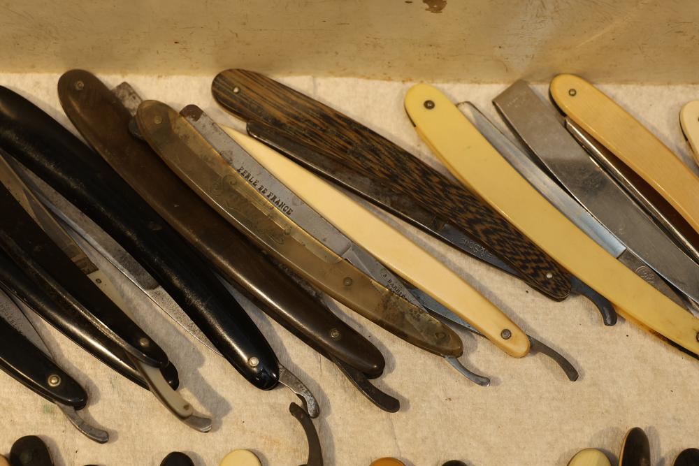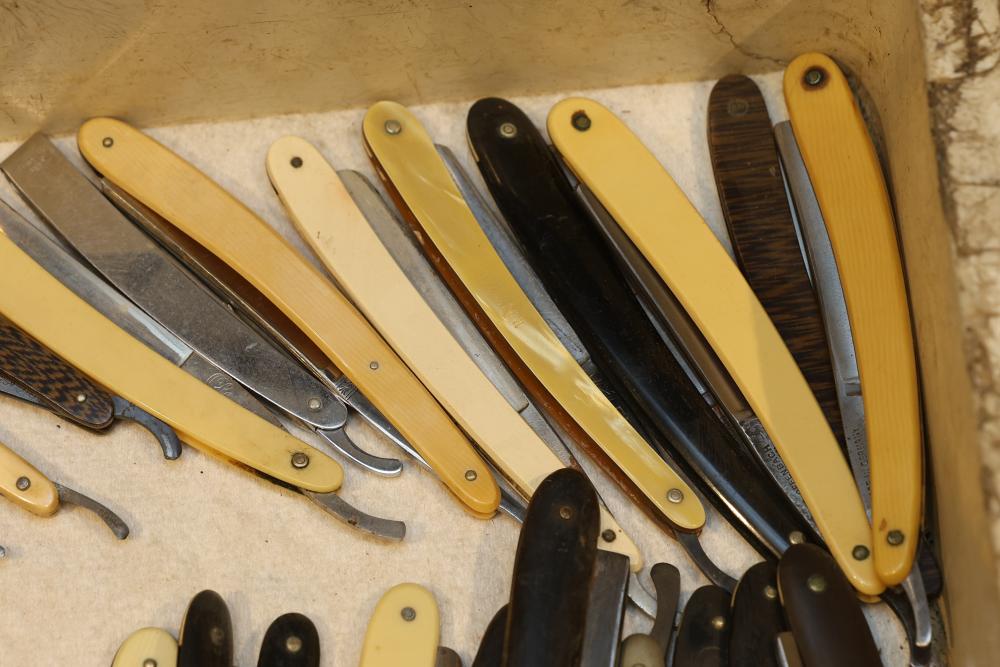50 Straight Razors from many different makers such as J.R. Torrey, W.R. Case, and M.E. Reppenhagen, featuring horn and celluloid scales, with mixed wedge blades. One has a mother of pearl blade end. See photos for details. Pickup only.
