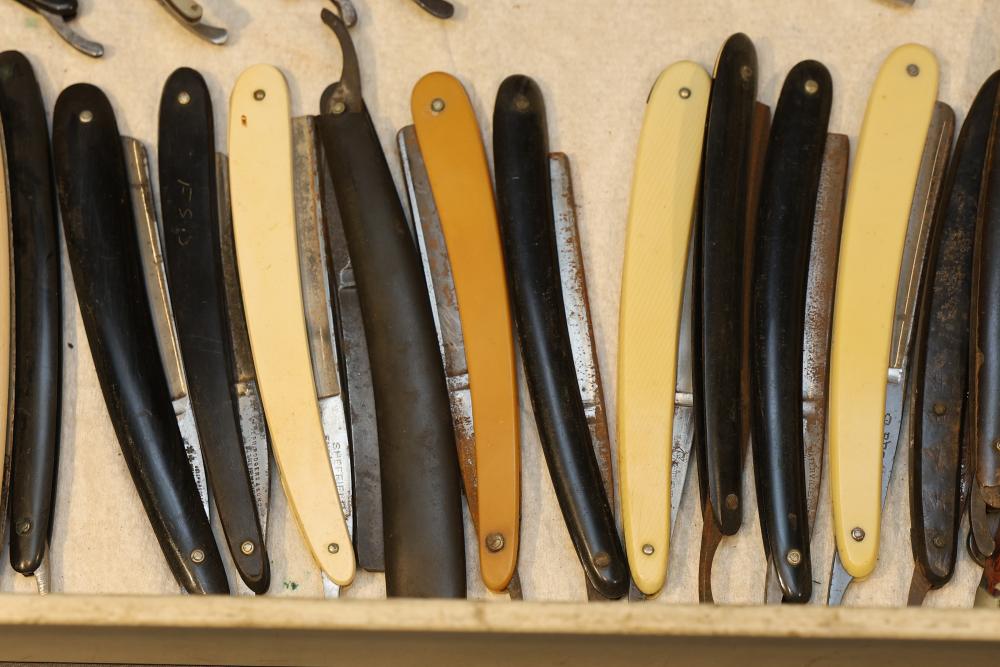 Items are from one straight razor collection & include cased matched pair of Joseph Rodgers & Sons straight razors having etched blade panels in velvet-lined Rodgers fitted case; Texas Luggage U.S. military style portable barber kit; porcelain shaving mugs with four lather brushes, collapsible compact travel shaving mirror with bowl; Warranted Razors having horn handles & notched Sheffield-style blades, etched Washington commemorative hollow blade with patriotic motif; Frederick Reynolds Sheffield straight razors; razors w/ mother of pearl scales/inlaid bar escutcheons/silver tone end caps/wedge-style blades; razors from Rogers & Sons, Wade & Butcher & Mappin's, featuring two horn scales & one celluloid with wedge style blades; razors from Clauss, J.A. Henckels, & H. Boker & Co., featuring mixed celluloid scales with hollow blades/includes multiple cases; barber Accessories including razor strops/sharpening stones/boxed Schick blades & more. Items are located in Pleasant Valley, NY.