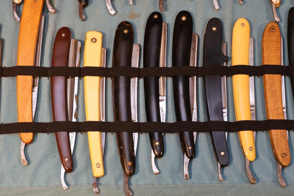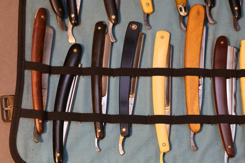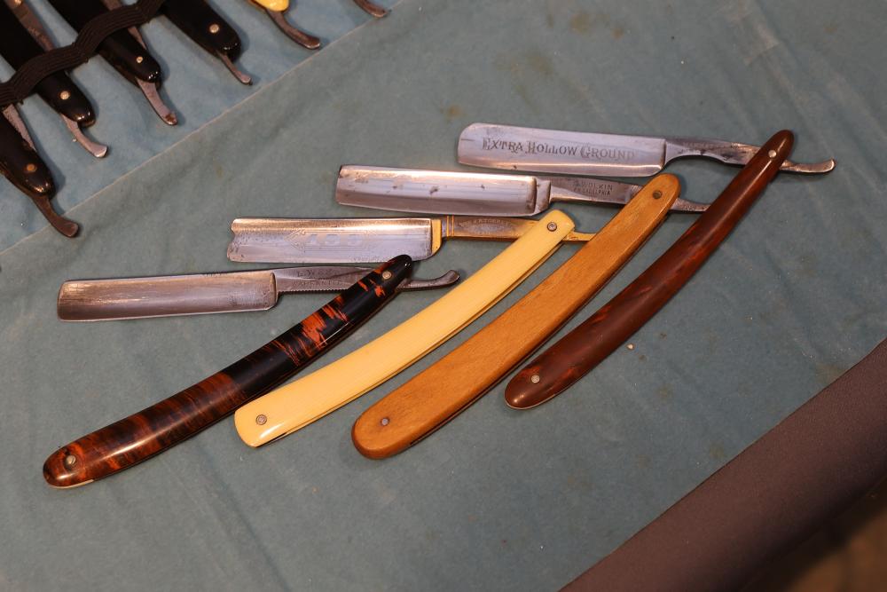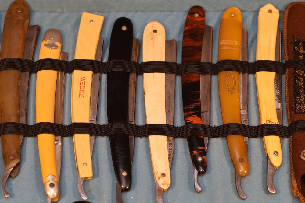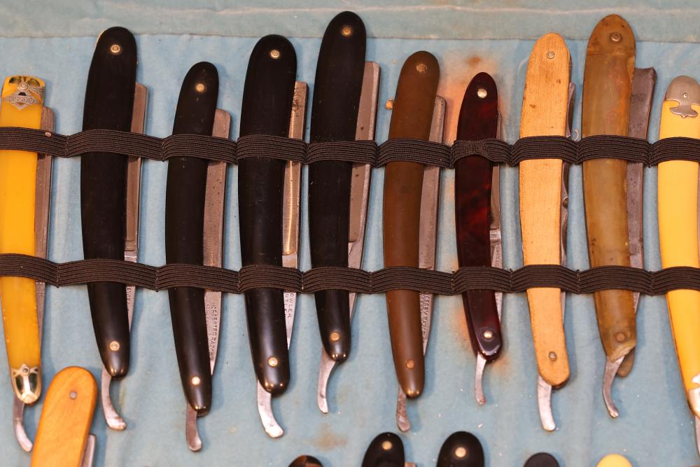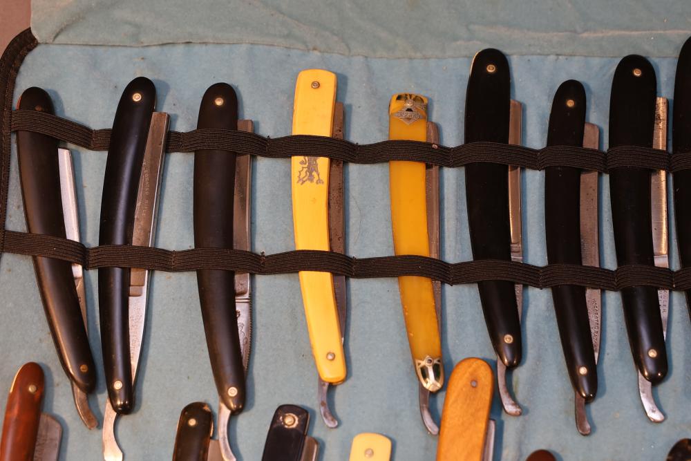51 Straight Razors from many different makers such as M. Wolkin, Cattaraugus, and L. West, featuring celluloid, wood, and horn scales, with hollow and wedge style blades. Includes a leather rollup case with a blue softcloth interior and external handle with belt straps for storage. See photos for details. Pickup only.