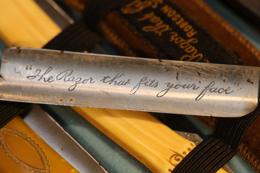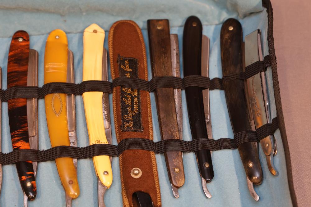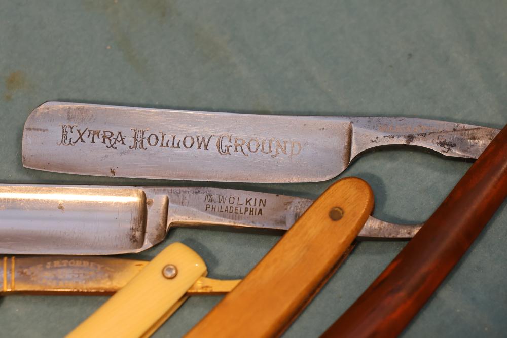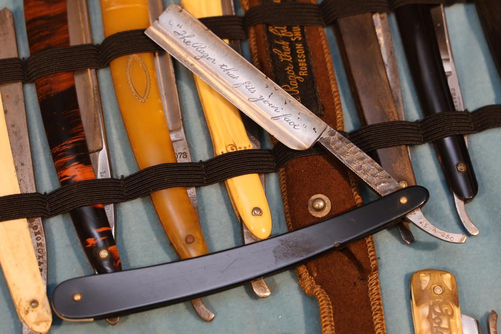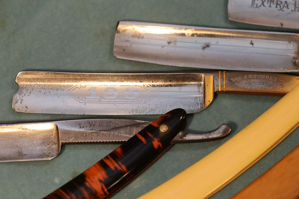Items are from one straight razor collection & include cased matched pair of Joseph Rodgers & Sons straight razors having etched blade panels in velvet-lined Rodgers fitted case; Texas Luggage U.S. military style portable barber kit; porcelain shaving mugs with four lather brushes, collapsible compact travel shaving mirror with bowl; Warranted Razors having horn handles & notched Sheffield-style blades, etched Washington commemorative hollow blade with patriotic motif; Frederick Reynolds Sheffield straight razors; razors w/ mother of pearl scales/inlaid bar escutcheons/silver tone end caps/wedge-style blades; razors from Rogers & Sons, Wade & Butcher & Mappin's, featuring two horn scales & one celluloid with wedge style blades; razors from Clauss, J.A. Henckels, & H. Boker & Co., featuring mixed celluloid scales with hollow blades/includes multiple cases; barber Accessories including razor strops/sharpening stones/boxed Schick blades & more. Items are located in Pleasant Valley, NY.