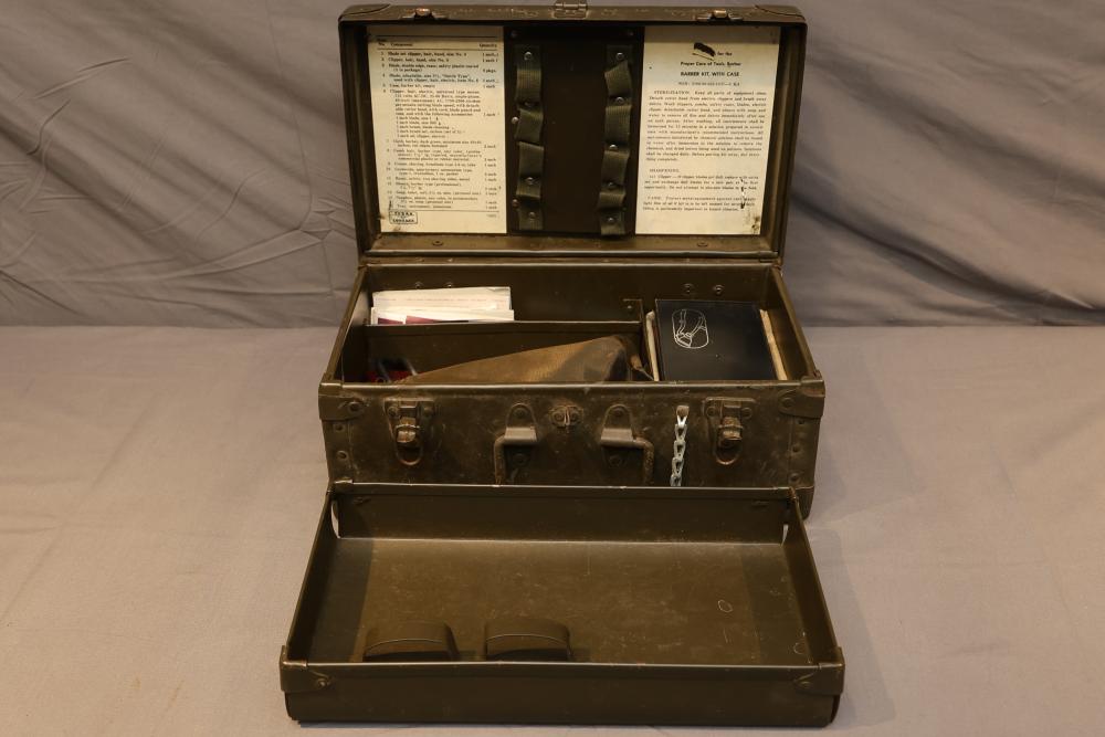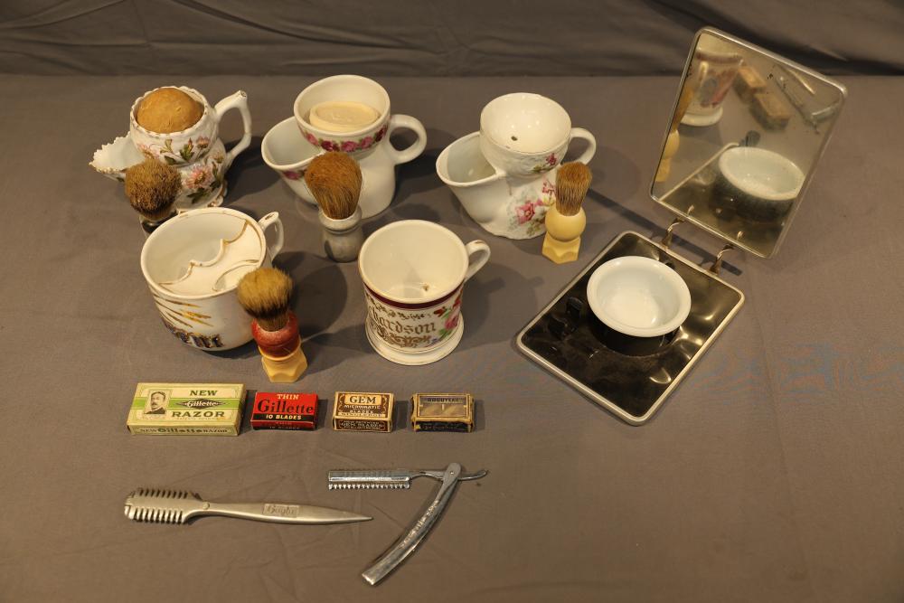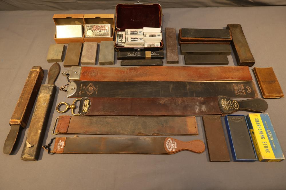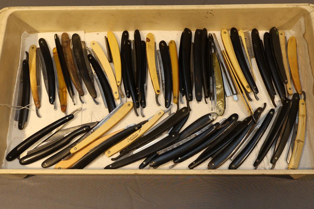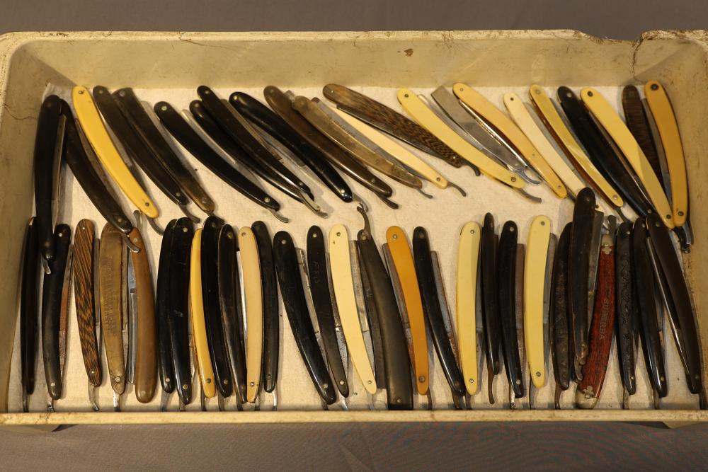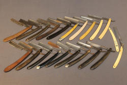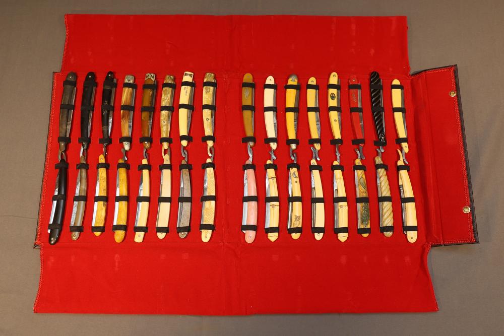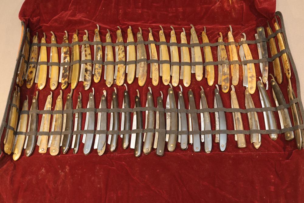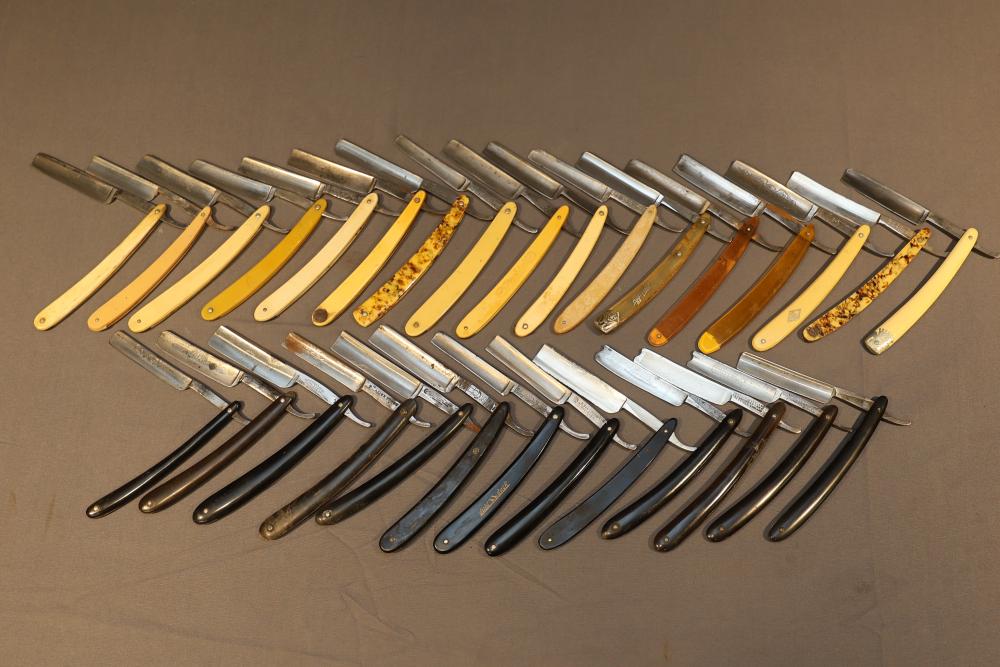 Items are from one straight razor collection & include cased matched pair of Joseph Rodgers & Sons straight razors having etched blade panels in velvet-lined Rodgers fitted case; Texas Luggage U.S. military style portable barber kit; porcelain shaving mugs with four lather brushes, collapsible compact travel shaving mirror with bowl; Warranted Razors having horn handles & notched Sheffield-style blades, etched Washington commemorative hollow blade with patriotic motif; Frederick Reynolds Sheffield straight razors; razors w/ mother of pearl scales/inlaid bar escutcheons/silver tone end caps/wedge-style blades; razors from Rogers & Sons, Wade & Butcher & Mappin's, featuring two horn scales & one celluloid with wedge style blades; razors from Clauss, J.A. Henckels, & H. Boker & Co., featuring mixed celluloid scales with hollow blades/includes multiple cases; barber Accessories including razor strops/sharpening stones/boxed Schick blades & more. Items are located in Pleasant Valley, NY.