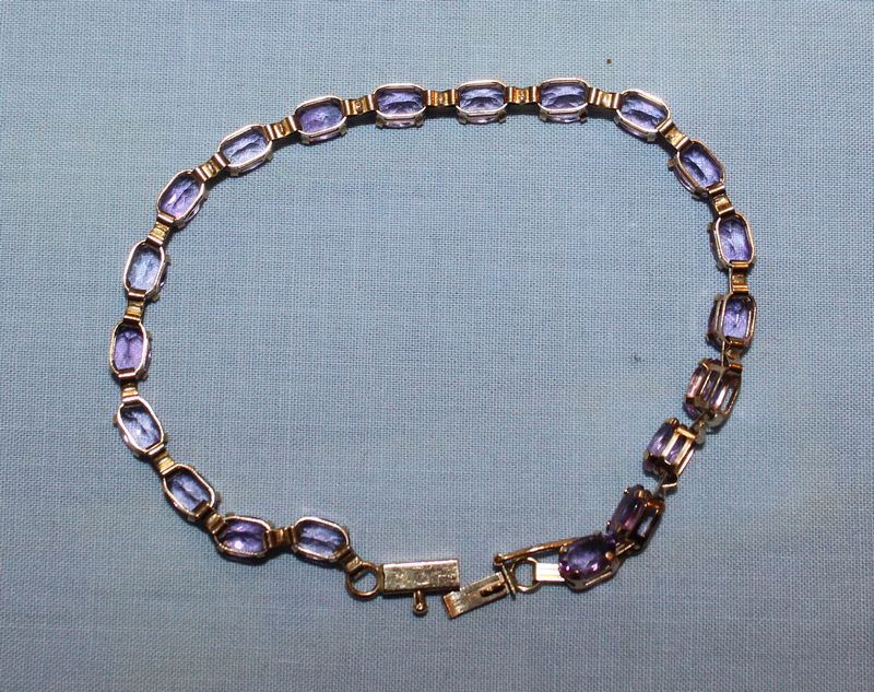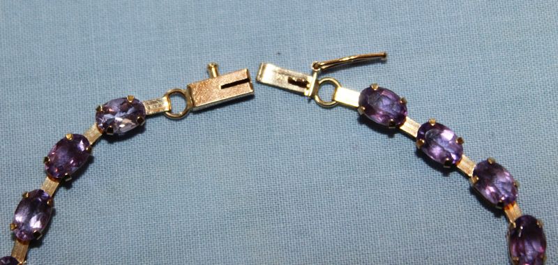 10k (stamped) yellow gold bracelet with 20 amethyst stones. The bracelet is 7.25"L and weighs 4.45 grams. The stones are about .25"L each. Shipping is available for this item.