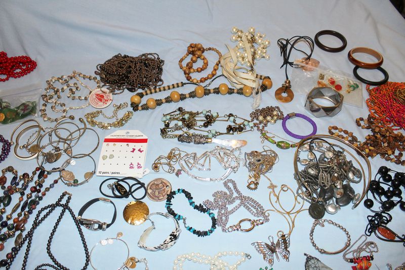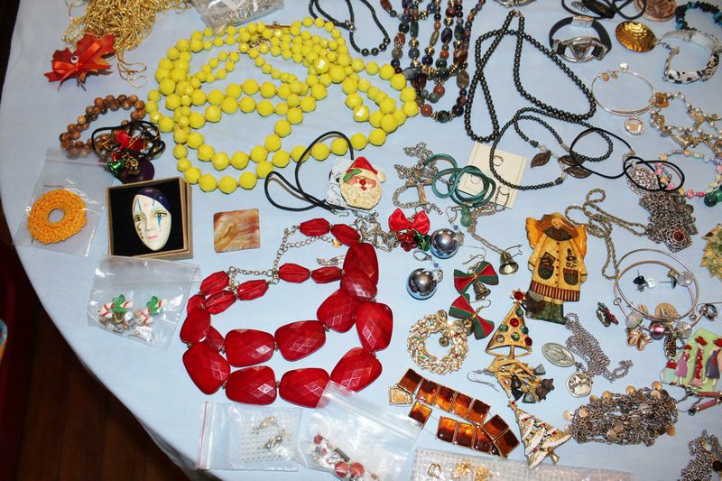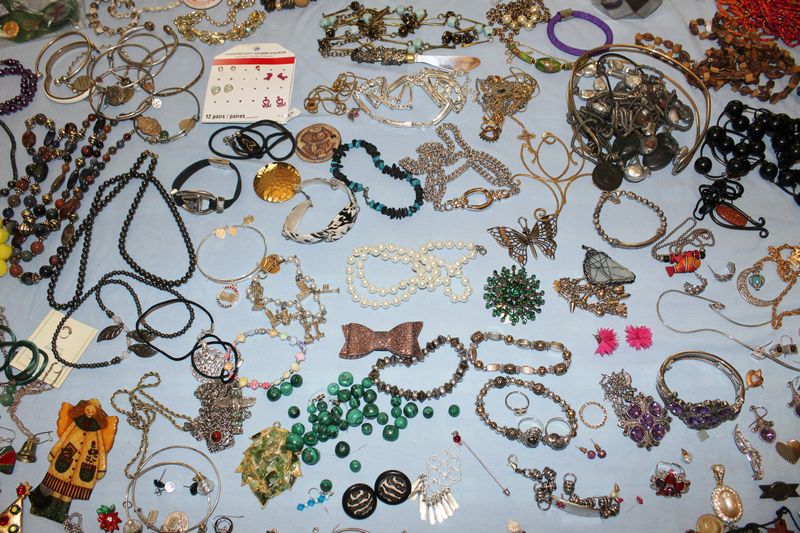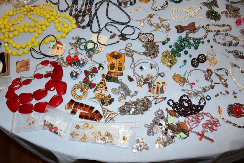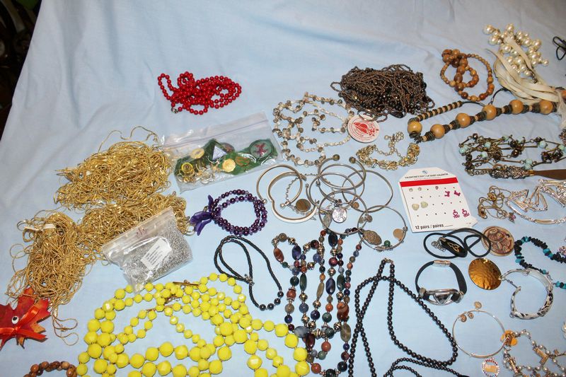 Costume jewelry including necklaces, bracelets, earrings, pins, pendants, religious items, and numerous gold tone chains.