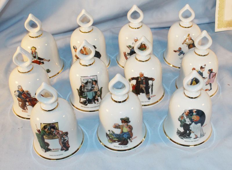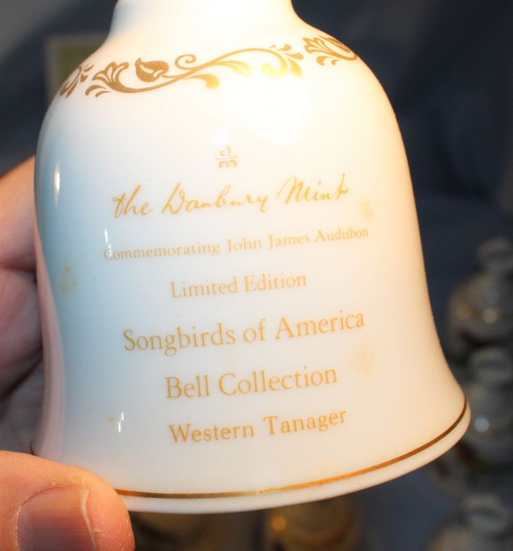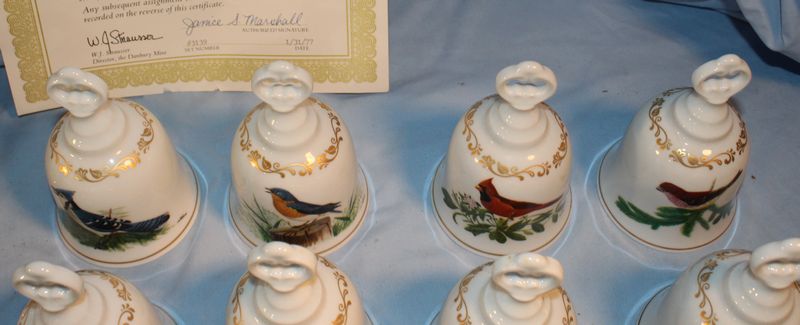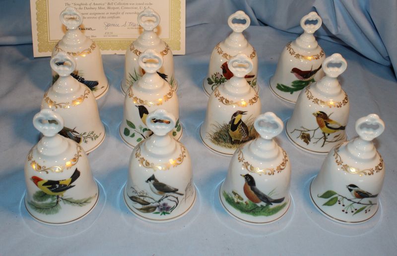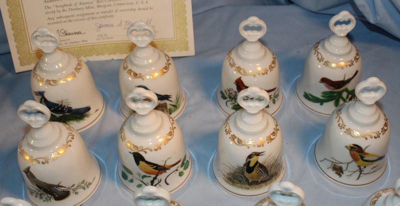 23 Danbury Mint porcelain collector bells including 12 Songbirds of America issued in 1977 (with C.O.A.) and 11 Wonderful World of Norman Rockwell C. 1979.