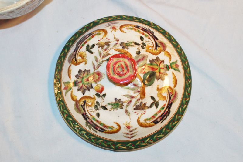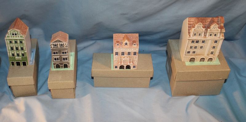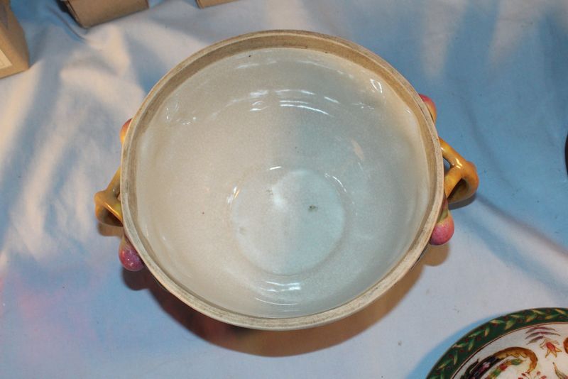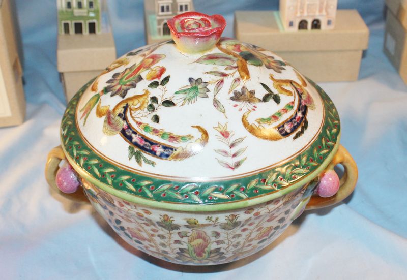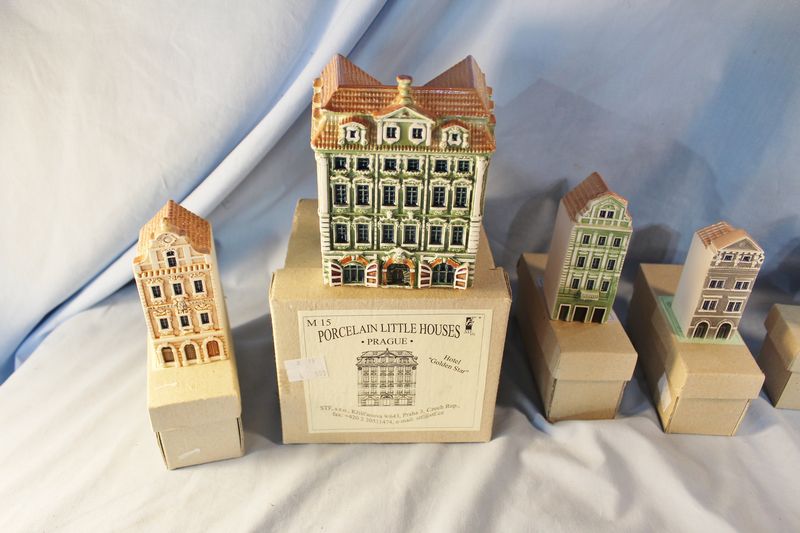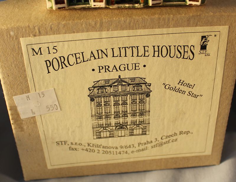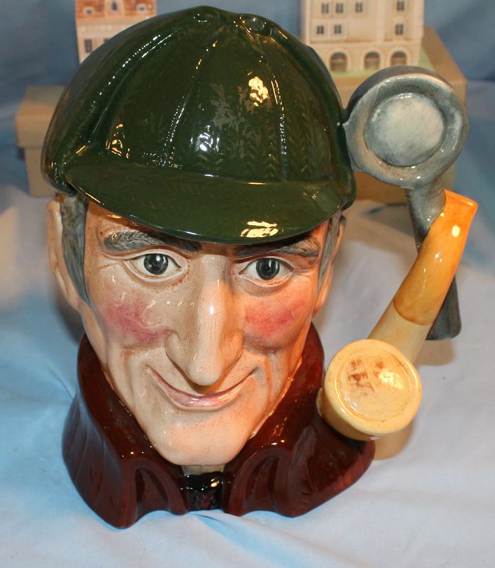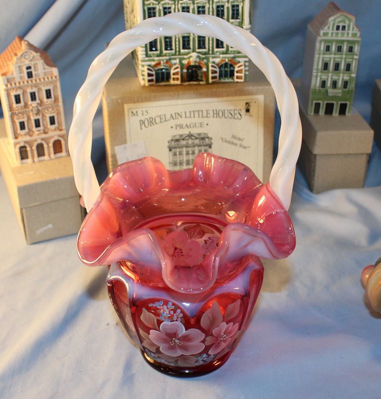 Porcelain and glass items including 5.5"T Chinese export pottery pot with lid; a 9"T Fenton art glass basket; a 7.5"T Royal Doulton "The Sleuth" Toby mug #6631; a Tiffany 5"T crytal brandy glass with box; 6 porcelain Czech miniature houses.