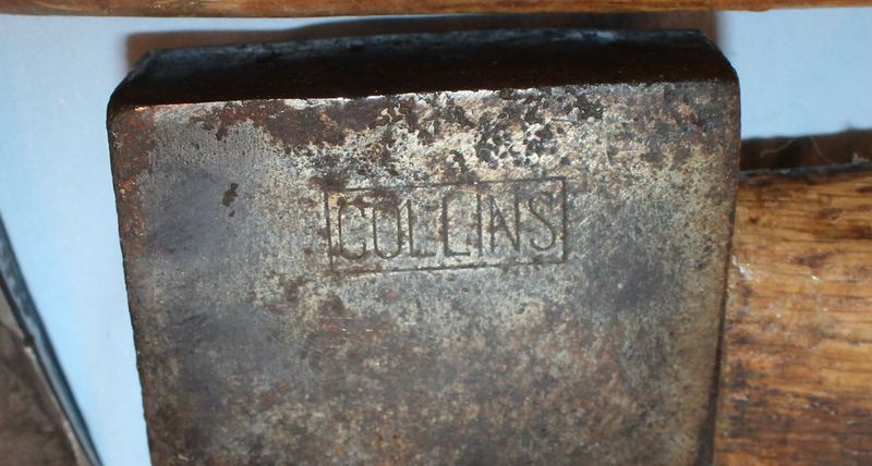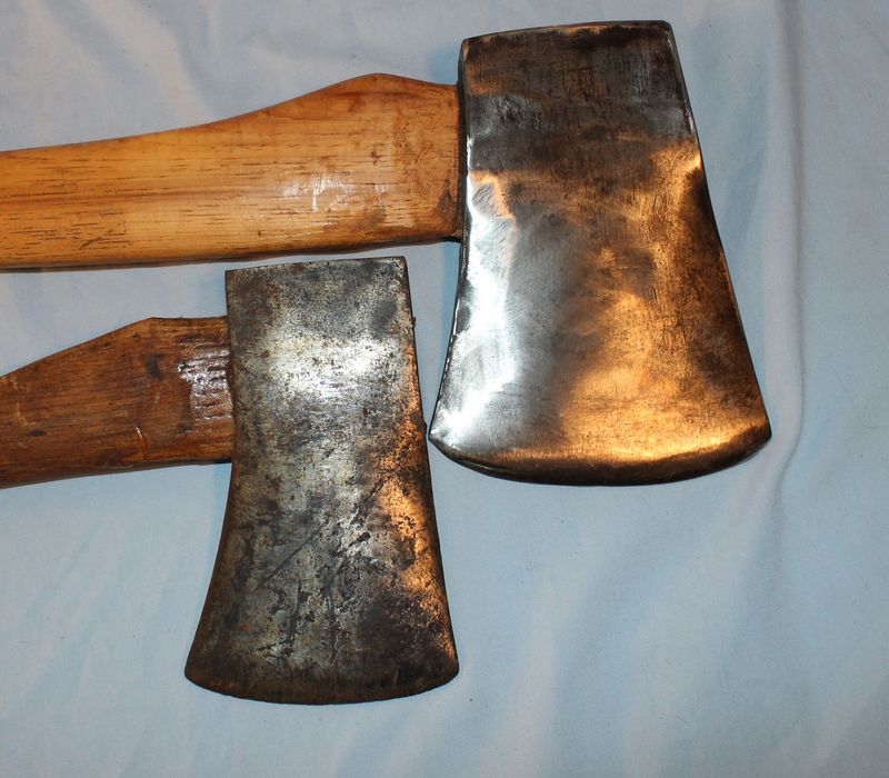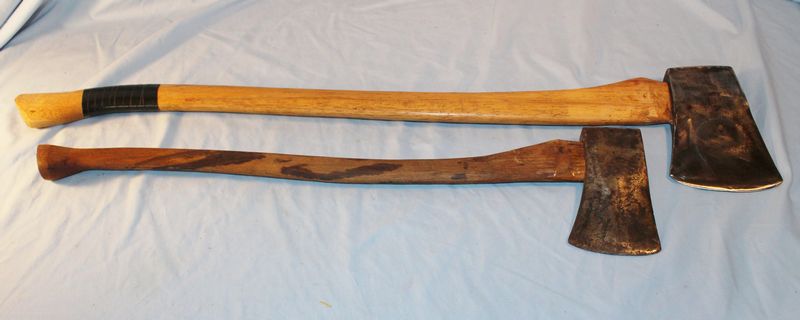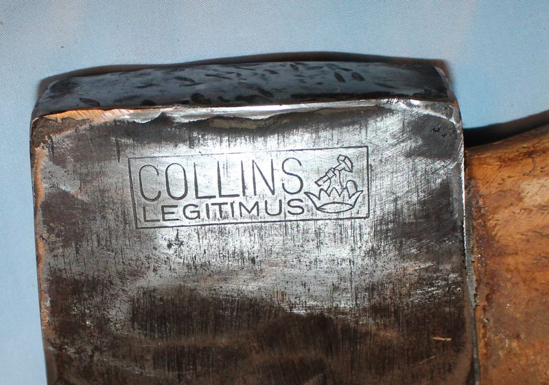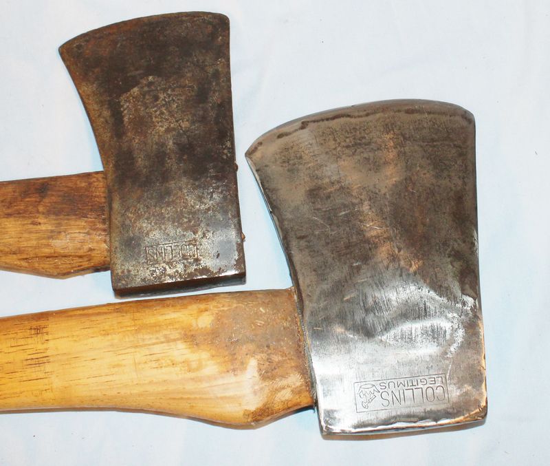 Two vintage Collins axes. The larger one has the Collins Legitimus logo and is 7"L. The smaller axe is just labeled "Collins" and is 6.25"L.