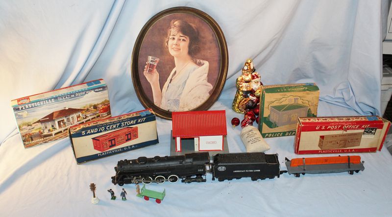 Model Railroad and other items including an American Flyer #322 "S" gauge New York Central engine and tender (functionality unk.); flat car; metal American Flyer Tool Shed; various plastic building kits; lead figures; repro Coca Cola tray; glass Christmas ornaments.