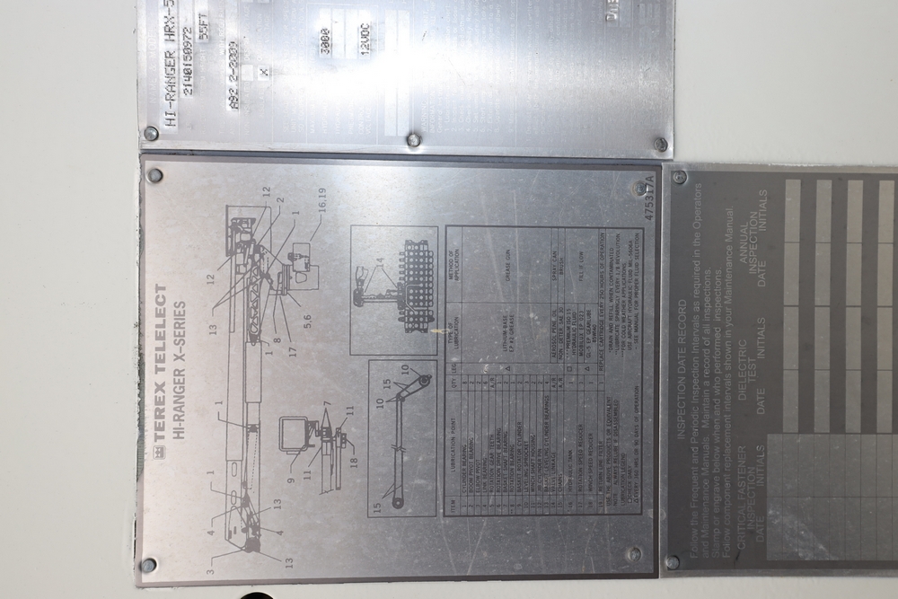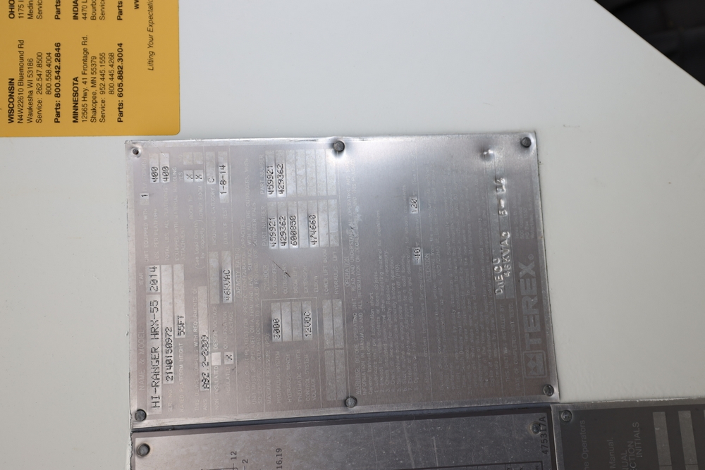 VIN: 1HTMKAZR4FH514322. Engine: 9.3L I6 CRDI Diesel. Allison Transmission. Equipped with 55-ft Terex Hi-Ranger aerial device. Model: HRX-55, Platform capacity: 400 lbs. Odometer reading: 39412, Hours reading: 7737. Seller reports: Age Condition, mileage. Title & key available.