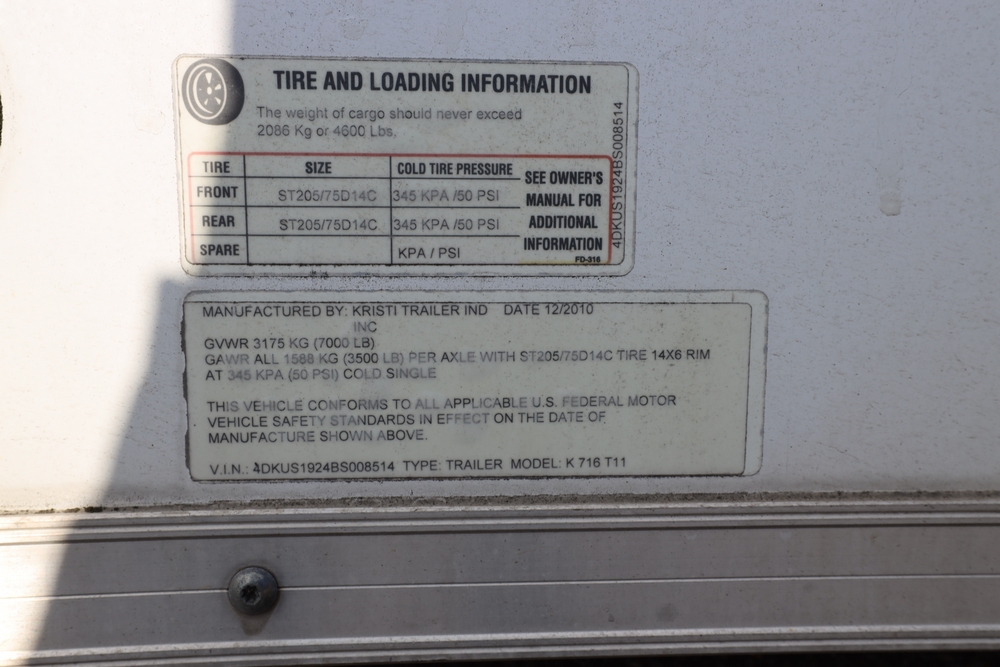 2011 Kristi K716 enclosed trailer. VIN: 4DKUS1924BS008514. Seller reports: Age Condition, mileage Title & key available.