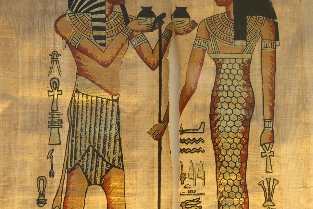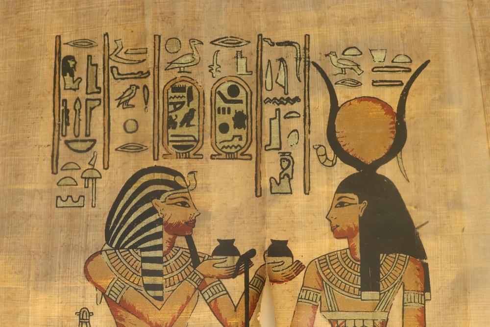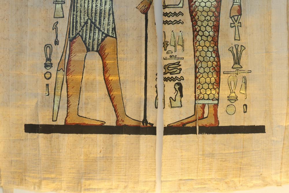 Framed Egyptian Papyrus Artwork Depicting Figures with Hieroglyphics. The piece is appearing to be crafted on traditional papyrus and portrays two human figures adorned in ornate attire, holding objects, and surrounded by intricately detailed hieroglyphic symbols. The artwork is complemented by a wooden frame, which provides a sturdy display. Pickup only.