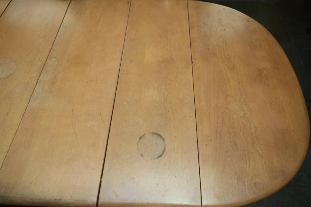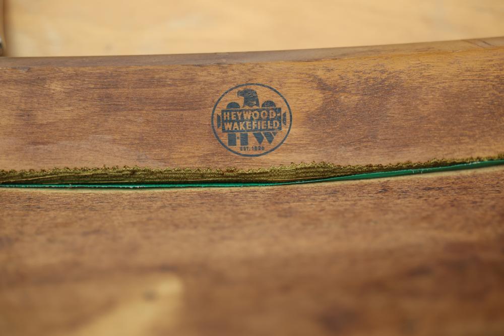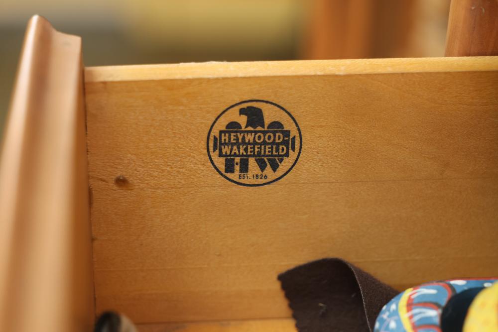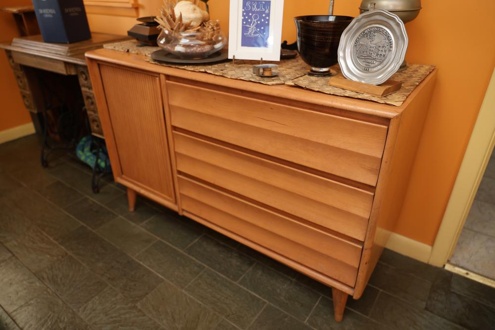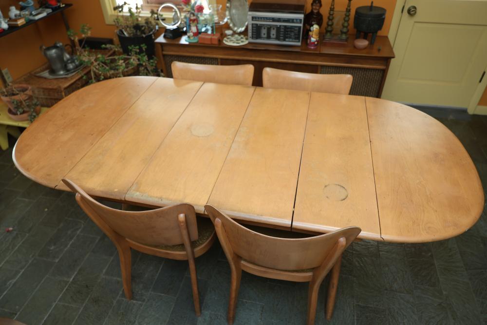 Heywood-Wakefield drop-leaf table with six chairs, displaying curved double-splayed legs, and a matching sideboard with multiple drawers. Includes all contents in and on the sideboard and table, such as utensils, decorative items, and accessories shown. Does not include items from other lots. Buyer is responsible for all help and materials necessary for safe and proper removal. Buyer must take all. Items located on first floor, no stairs. Pickup only.