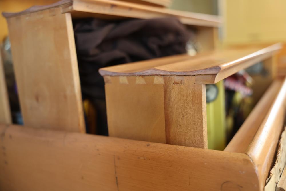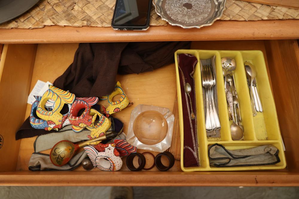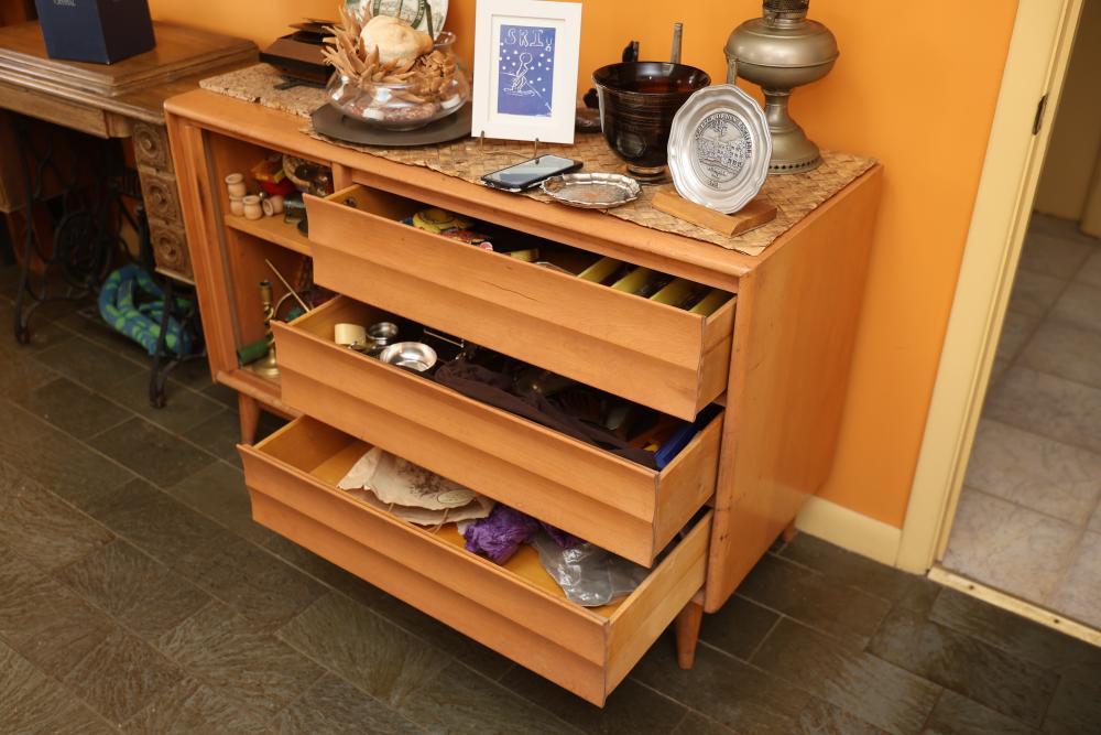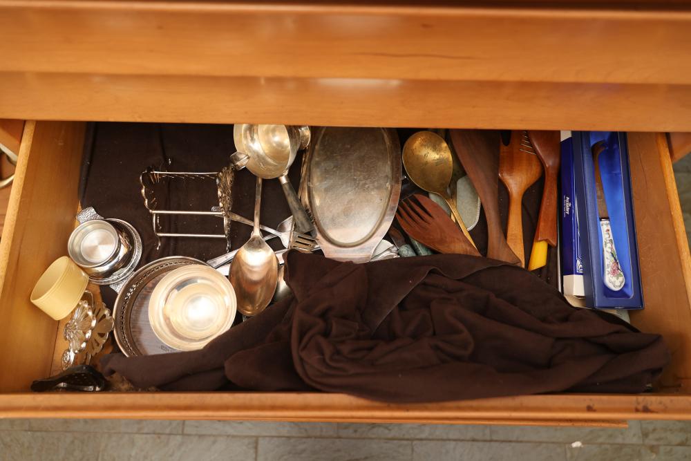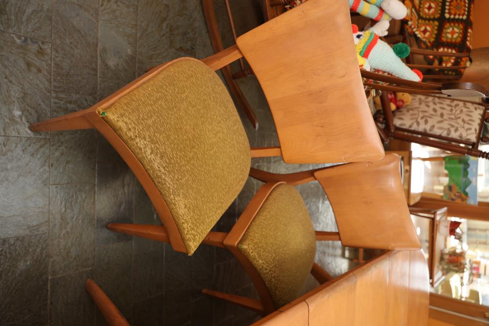 Heywood-Wakefield drop-leaf table with six chairs, displaying curved double-splayed legs, and a matching sideboard with multiple drawers. Includes all contents in and on the sideboard and table, such as utensils, decorative items, and accessories shown. Does not include items from other lots. Buyer is responsible for all help and materials necessary for safe and proper removal. Buyer must take all. Items located on first floor, no stairs. Pickup only.