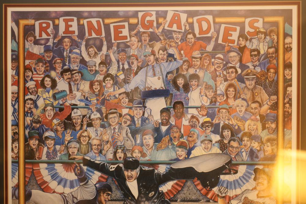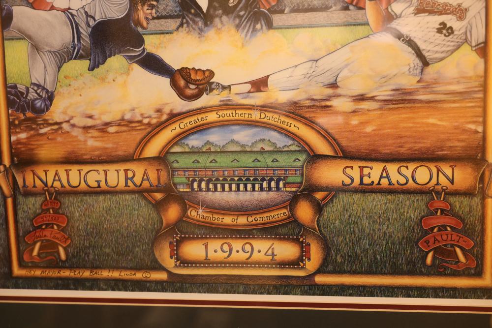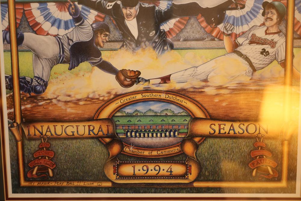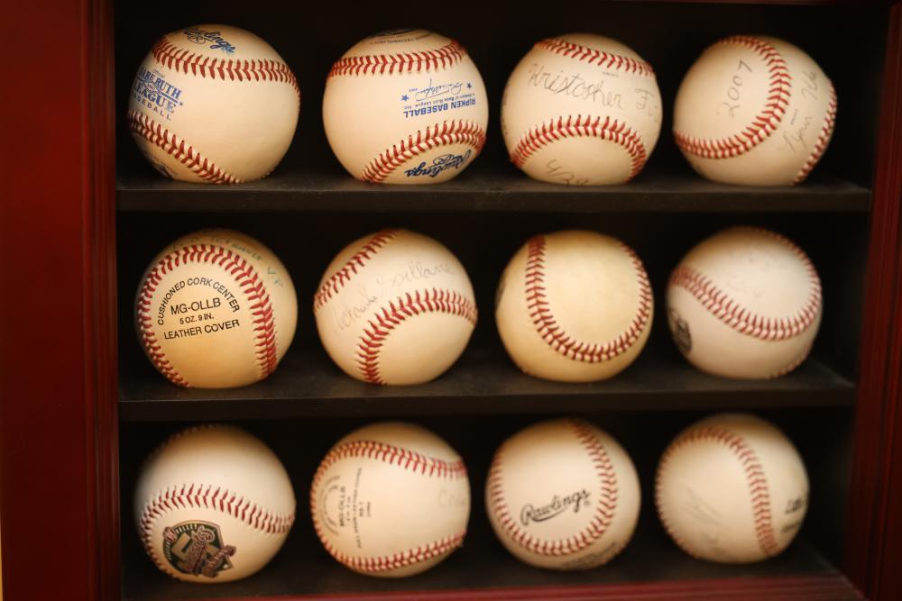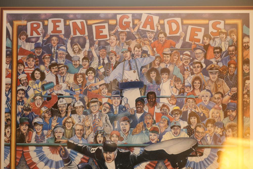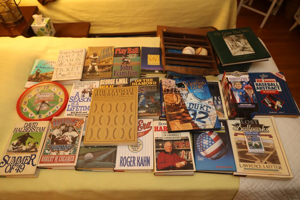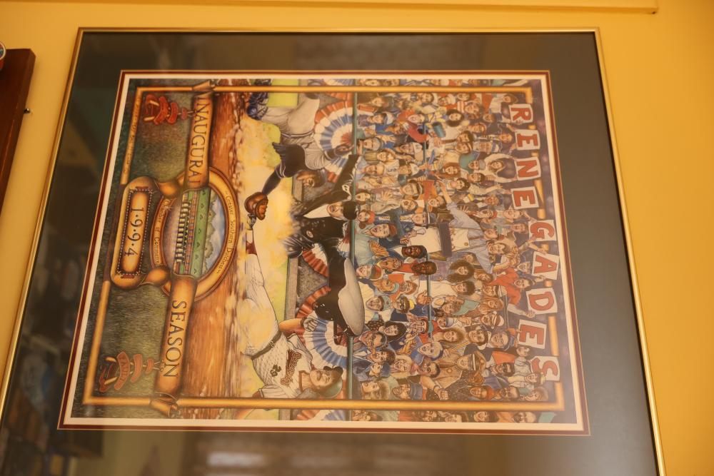 Baseball Memorabilia Including Signed Baseballs, Books, and Framed Art. This assortment includes autographed baseballs displayed in a case, baseball-themed books, and framed items, including a limited-edition art print commemorating the 1994 inaugural season of the Renegades. A vintage-style catchers mask and other baseball-related framed collectibles are also featured. Does not include items from other lots. Buyer is responsible for all help and materials necessary for safe and proper removal. Buyer must take all. Pickup only.