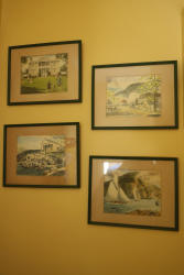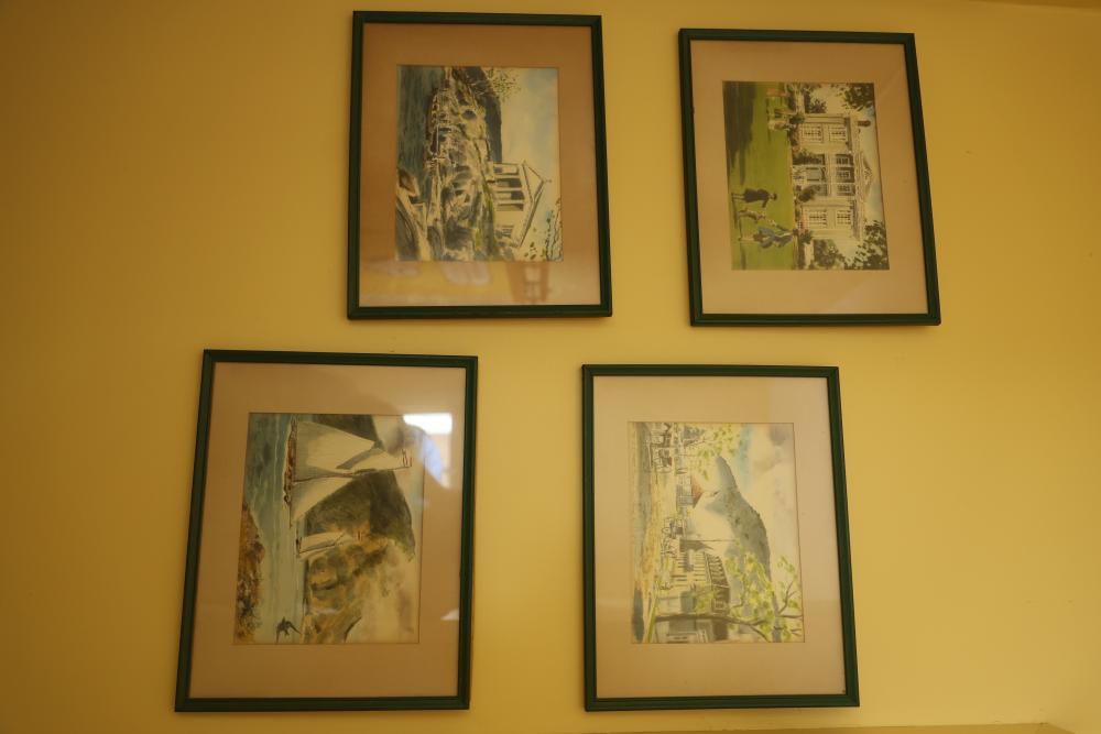 Four Framed Davis Gray wall art pieces with Historical Scenes. This collection features framed reproductions depicting scenes like an elegant estate, a summer rain in Cold Spring, a chapel, and sailing boats near mountains. Each piece is framed and appearing to be signed by Davis Gray. Buyer must take all. Pickup only.