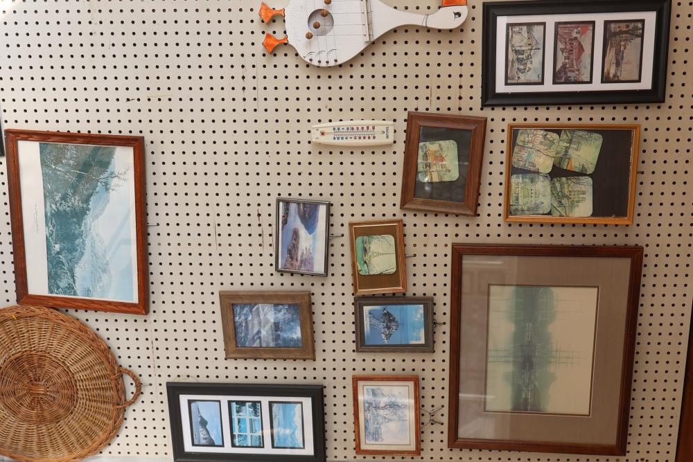 Framed Artwork and Prints with Mixed Wall Decor. Includes a watercolor-style depiction of the Eiffel Tower with park, a framed photograph of a waterfall, three vertically framed architectural scenes, an etched stone with bird motif, a scenic shoreline watercolor, framed woodland and lakeside art prints, a framed cross-stitch of a milkmaid, framed Snoopy illustration poster, two animal-themed hangings, a framed image of a lakeside landscape, an engraved wall panel, etc. Does not include items from other lots. Buyer must take all. Pickup only.