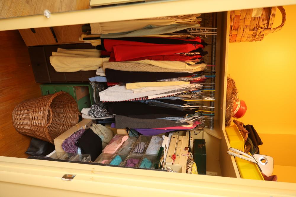 Clothing, Shoes, Accessories, Linens, Containers, Fur Garments, and Household Items incl; a large variety of clothing in both men's and woman's sizes, ties, footwear stored in open cubby shelving, handbags in bins, costume jewelry in boxes, folded textiles in transparent drawers, and stored luggage items. A Does not include items from other lots. Buyer is responsible for all help and materials necessary for safe and proper removal. Buyer must take all. Items located on first floor, no stairs. Pickup only.