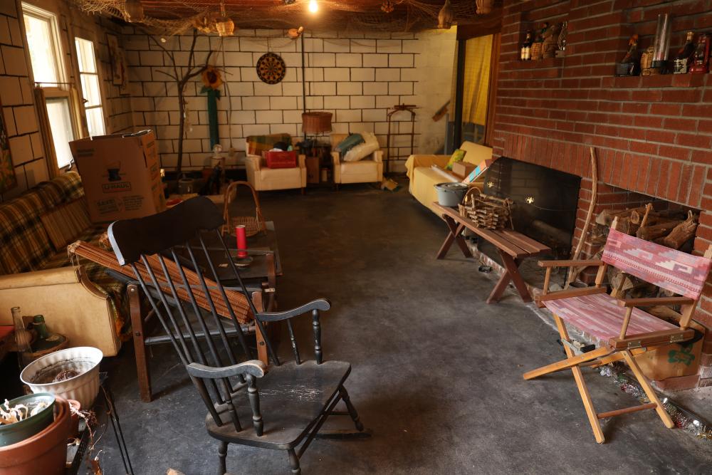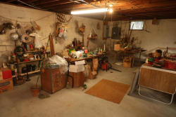 Household and Garden Items, Plant Pots, Tools, and Metalware's. Includes multiple shelves of terracotta and painted plant pots, metal shelving, wicker baskets, gardening tools, cans, glass jars, vintage-style display items, Kenmore dehumidifier, small decorative objects, an upholstered lounge chair with metal frame, etc. Does not include items from other lots. Buyer is responsible for all help and materials necessary for safe and proper removal. Buyer must take all. Items are located in basement with ground floor access. Pickup only.