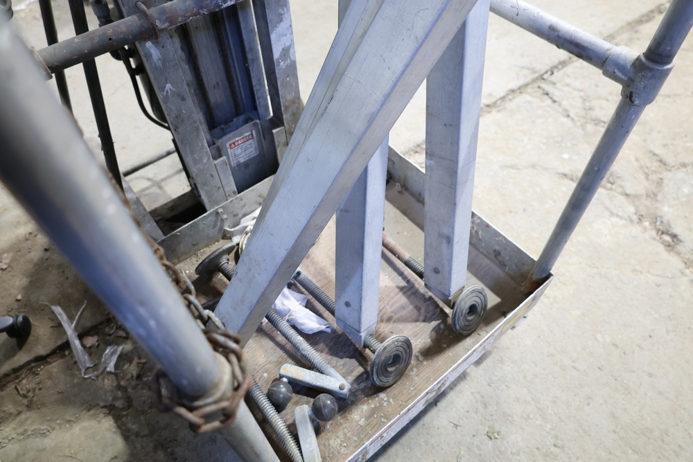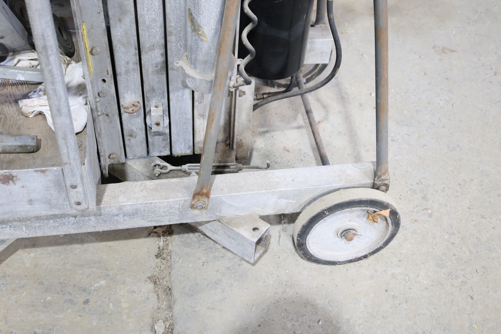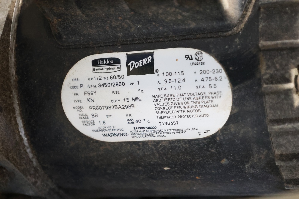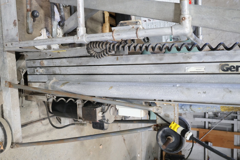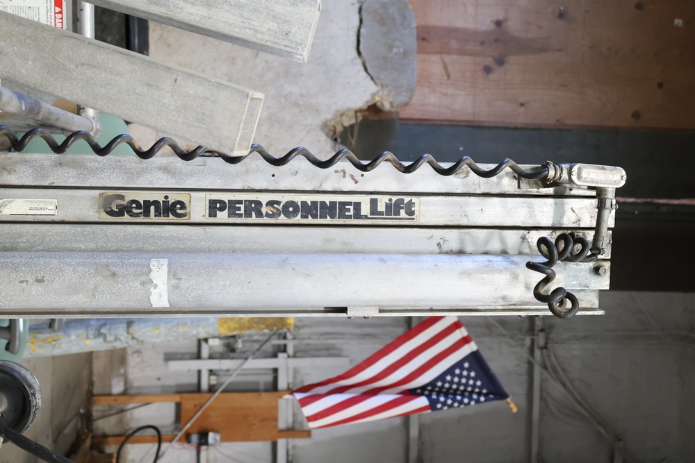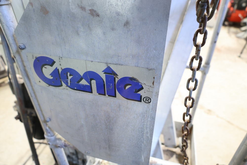 Electric-powered Genie personnel lift on a rolling base, equipped with a Doerr/Emerson 1/2 HP motor (model PR607983BA298B) with dual-voltage capability (100–115V / 200–230V). Includes platform, outriggers, and lift mechanism as shown. Seller reports: Operates as intended.
