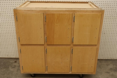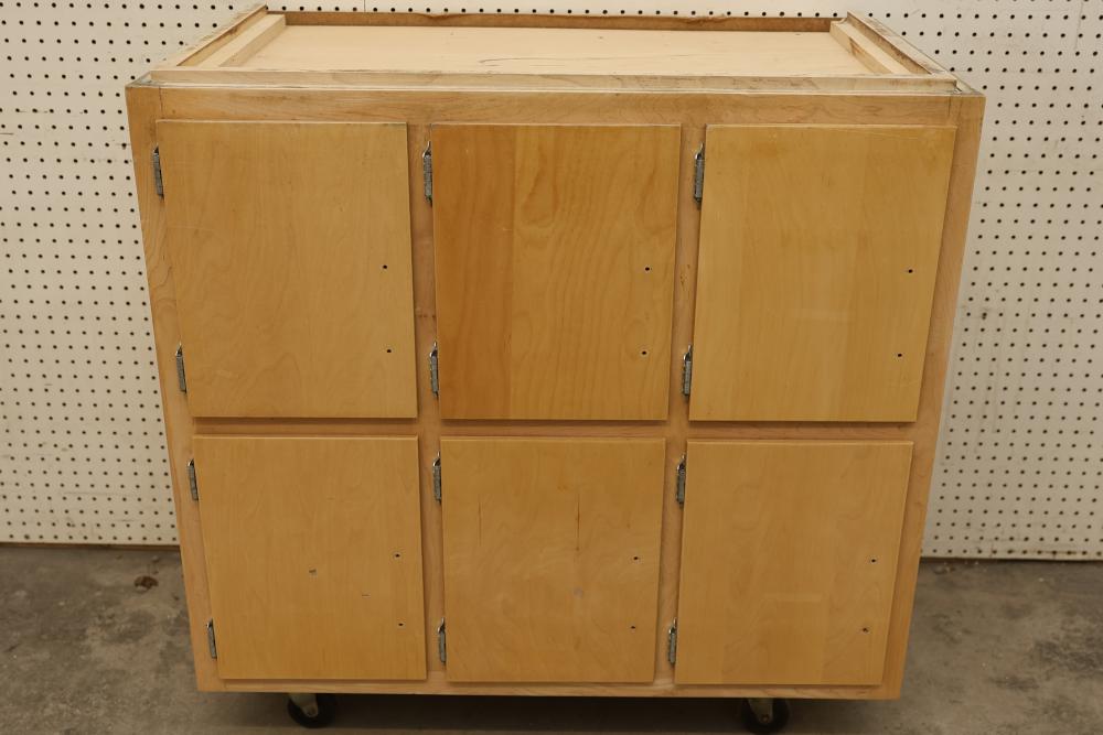 Wooden Cabinet Set With 6 Cabinets, 36 Inches Long, 36 Inches Wide, 21.5 Inches Deep. The cabinet features six compartments with hinged doors, providing ample storage space. The set measures 36 inches in length, 36 inches in width, and 21.5 inches in depth. The surface shows some signs of wear. Dolly not included. Pickup only.